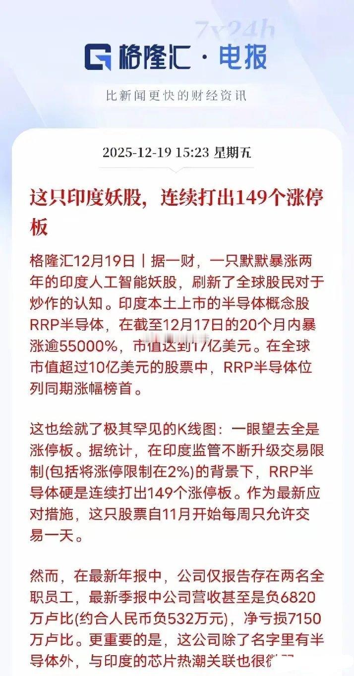 三哥真牛。20个月暴涨55000%,连续拉149个涨停板,简直了!难怪印度称散户天堂,散户T+0,机构T+3,阿三太会玩了!奇怪的是,如此疯狂的上涨没有风险吗?为什么也不警告一下子?佩服,咱们也只有羡慕人家的份了。