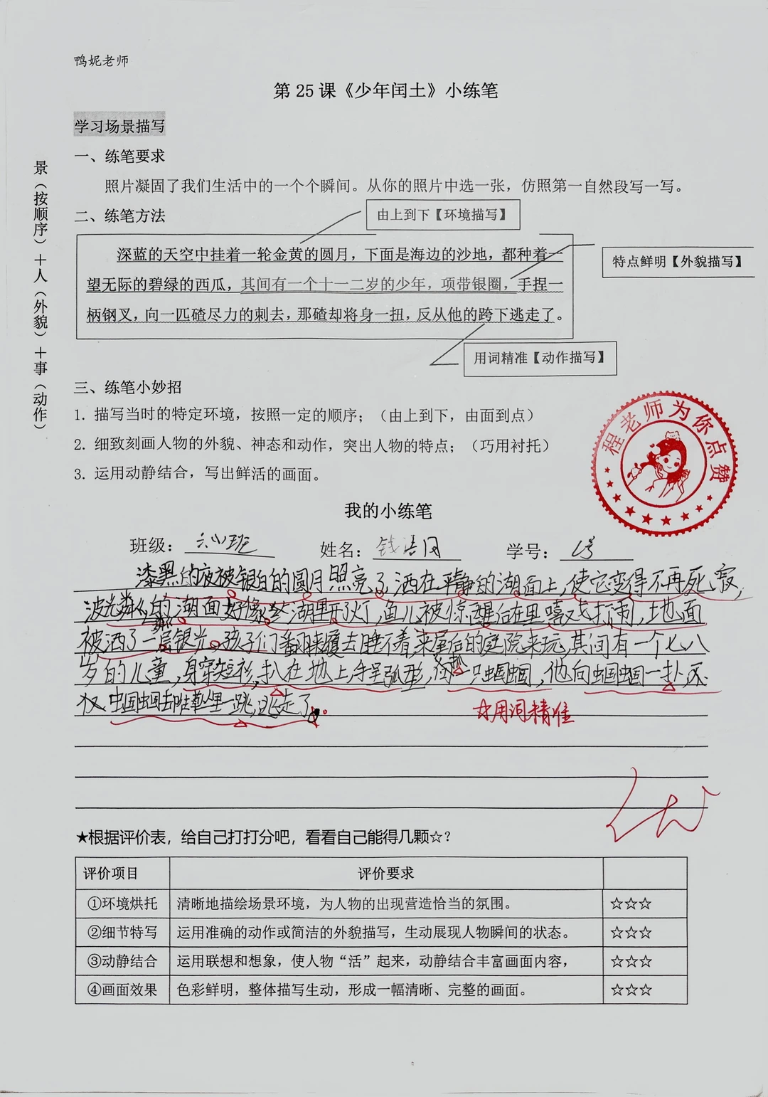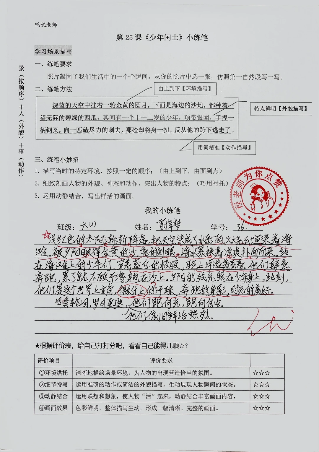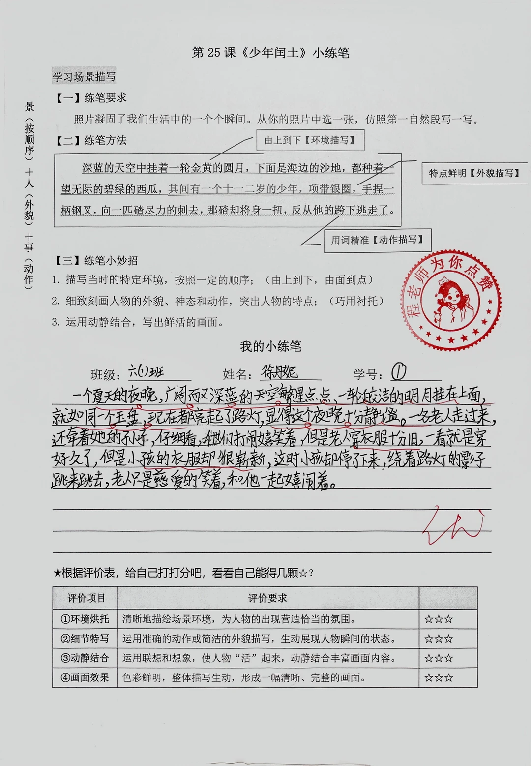 [向右R]【练习主题】场景的描绘 这次练习的重点是对特定场景下人物的描绘,包括人物的外貌、动作和神态,用环境来衬托人物,写出鲜活的画面。 🍃每次小练笔我会根据练笔要求自己制作练习单,提供清晰的练笔方法和指导,帮助学生搭建写作支架,并根据评价表给自己打分。 [向右R]【练笔指导】 ①描写当时的特定环境,按照一定的顺序;(由上到下,由面到点) ②细致刻画人物的外貌、神态和动作,突出人物的特点;(巧用衬托) ③运用动静结合,写出鲜活的画面。