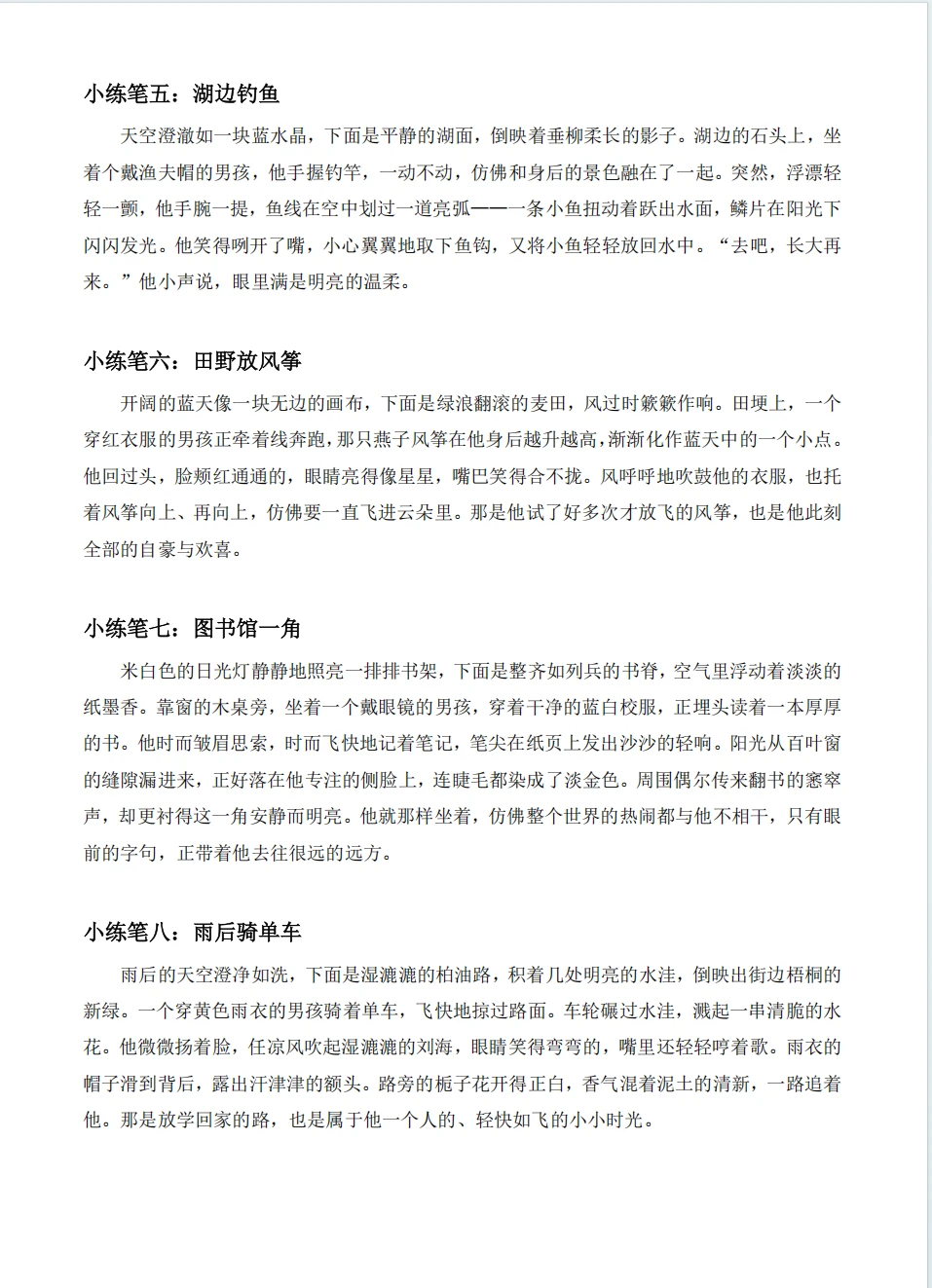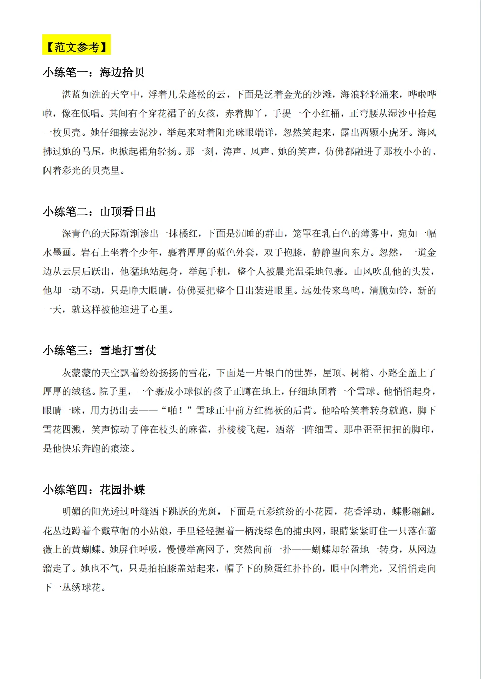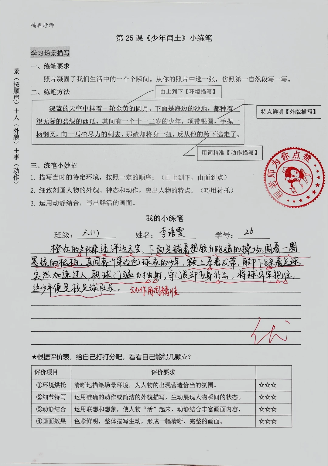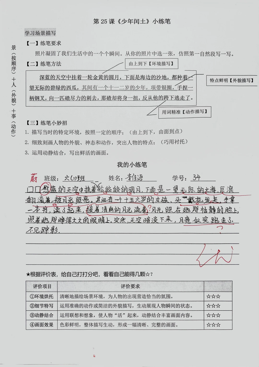 [向右R]【练习主题】场景的描绘 这次练习的重点是对特定场景下人物的描绘,包括人物的外貌、动作和神态,用环境来衬托人物,写出鲜活的画面。 🍃每次小练笔我会根据练笔要求自己制作练习单,提供清晰的练笔方法和指导,帮助学生搭建写作支架,并根据评价表给自己打分。 [向右R]【练笔指导】 ①描写当时的特定环境,按照一定的顺序;(由上到下,由面到点) ②细致刻画人物的外貌、神态和动作,突出人物的特点;(巧用衬托) ③运用动静结合,写出鲜活的画面。