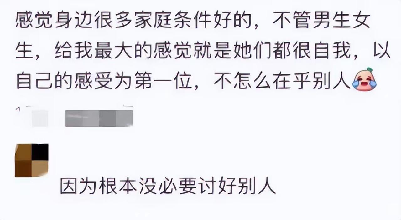 图1这个根本不像有钱人家的女儿好吧[尬笑]。富家子女就算不是等着别人服务,也不会有时刻服务别人的意识吧[我想静静],那不是佣人的品质吗?要么就是讨好型人格。 有钱人家的不是应该像图2那样吗? 如果说有钱人家的孩子很会做人,让人如沐春风,那也不是抽两片擦手纸等着给别人递上吧?这显得特“奴才”…… 不管贫富,抽两张擦手纸递给长辈,那比较合理……