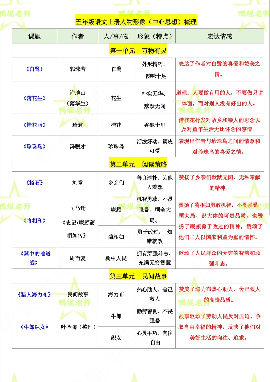 刚整理出来的期末复习资料👇 ①五年级上册人物特点和中心思想|表格梳理【早读版】 ②整理的默写单(分答案版和空白版) 考试复习好帮手,先进行读记,再进行默写
