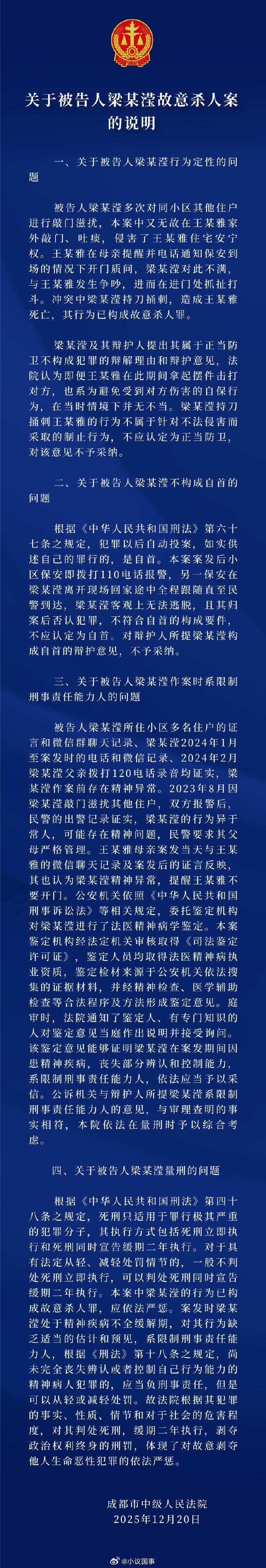 梁某滢患案发期间患有精神病为限制刑事责任能力人,一审被判处死缓。同时,法院还进行了公开说明,对大家关注的4大问题进行了释法答疑。详细情况见下图。