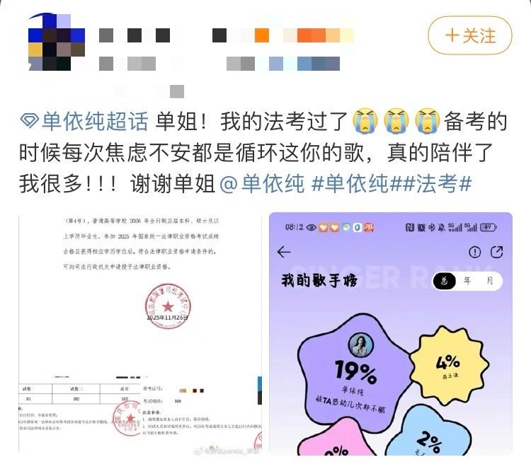 追星人的能力有多全面 单依纯这么牛就算了怎么粉丝也这么厉害!跟着单姐的脚步往更优秀的方向发展,前几天刷到有粉丝通过了法考,还有其他粉丝在不同岗位努力实现自己的价值,追星的意义在此刻到达了顶峰!
