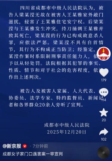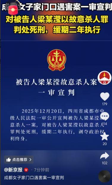 终于判了,梁珂莹获死刑缓期两年执行!其实但凡懂点法律的,就会明白这个结果几乎毫无悬念。 现在有个奇怪的现象:几乎每个杀人犯杀人后都说是精神病人!难道精神病,就可以肆无忌惮随意杀人泄愤? 跑别人家里杀人,还敢说自卫,真把别人当傻子呀,这孩子家长咋教育的,最应该判死刑的是她父母啊。 有精神病,从来没有就诊记录,杀人以后去华西医院鉴定精神病,普通人你去华西医院,看看你能当天挂上华西医院的号码,精神病鉴定最快十五天,华西医院两个小时就鉴定出来了,百思不得其解!
