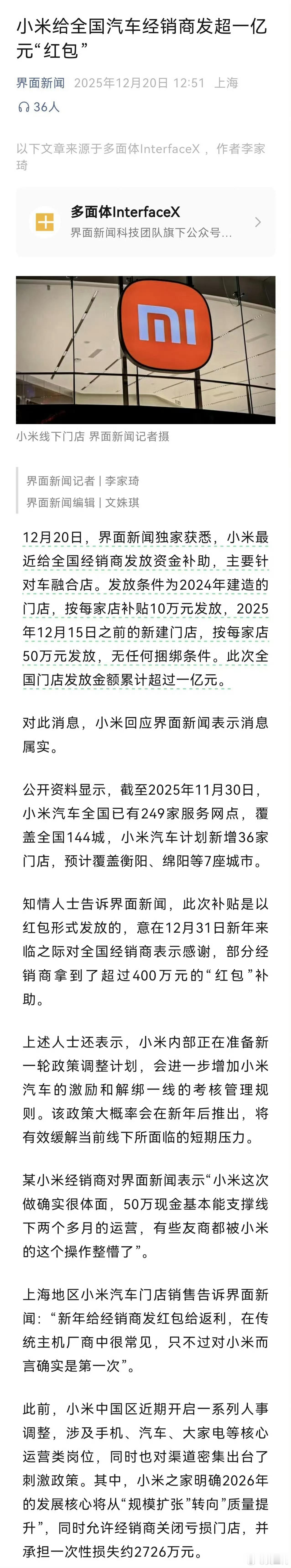 小米汽车直接给经销商发超1亿元“红包”:24年建店补10万、25年新建补50万,无捆绑条件,最多的单店拿400万!目前小米汽车249家网点覆盖144城,还在扩店当中,可以说相当体面了