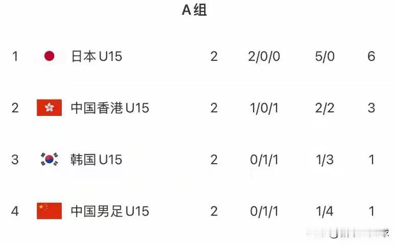中韩u15战成1:1,场面不好看、结果过得去,但看积分榜,仍未摆脱垫底。 作为东道主,赛程安排的如意算盘打得挺好的:首战逼平日本队、次战小赢韩队、末战大性中国香港队,u15国足卫冕就没问题。 但人算不如天算,国足首轮0:3惨败日本抢了个大底,而中国香港2:0拿下了韩国队;次轮日本2:0赢下港足锁定冠军,国足没拿下韩国队,只有末轮大胜港足2球以上,才能避免把卫冕变成大底。但按前两轮表现看,仅进一个点球的u15国足拿啥赢港足呢?