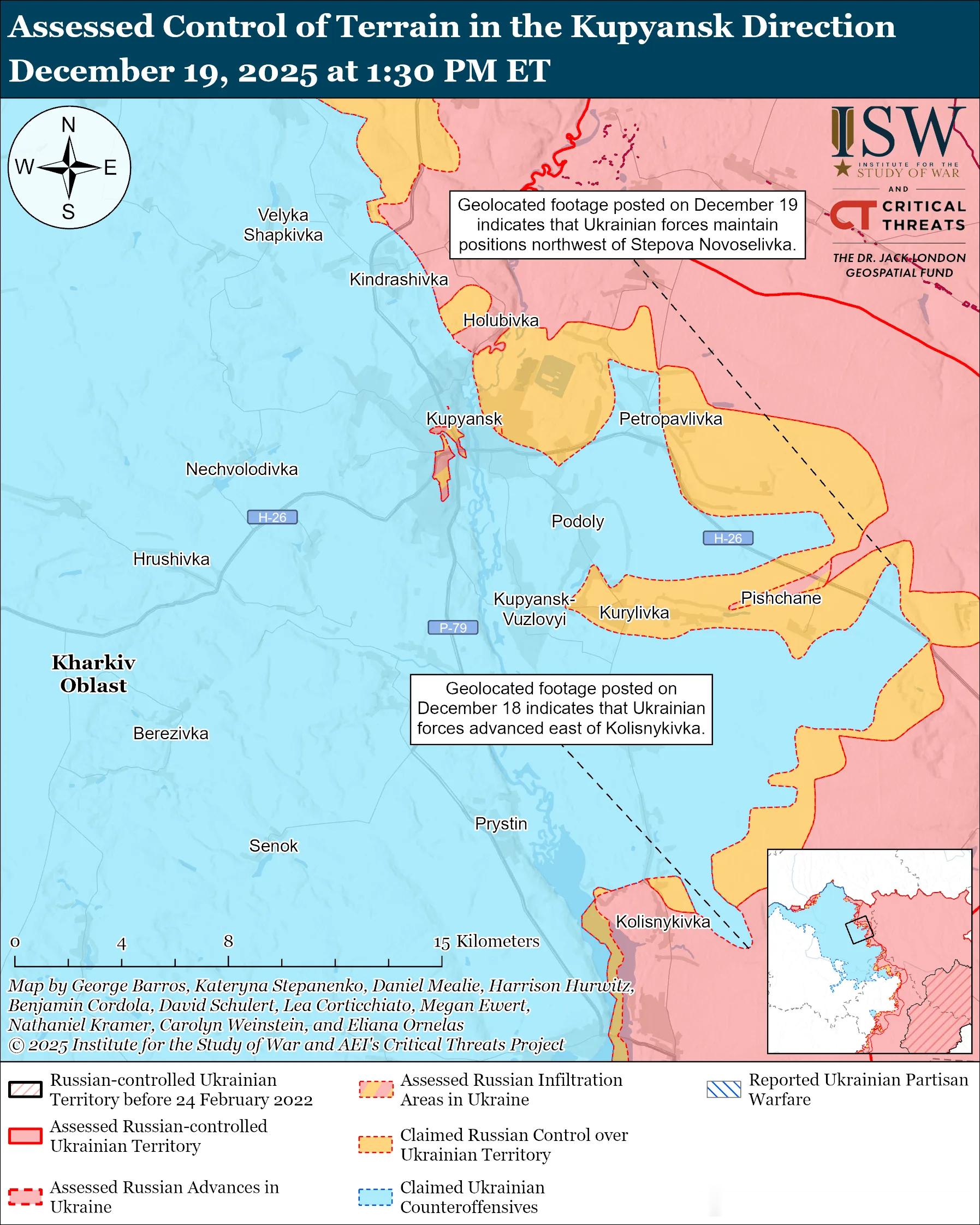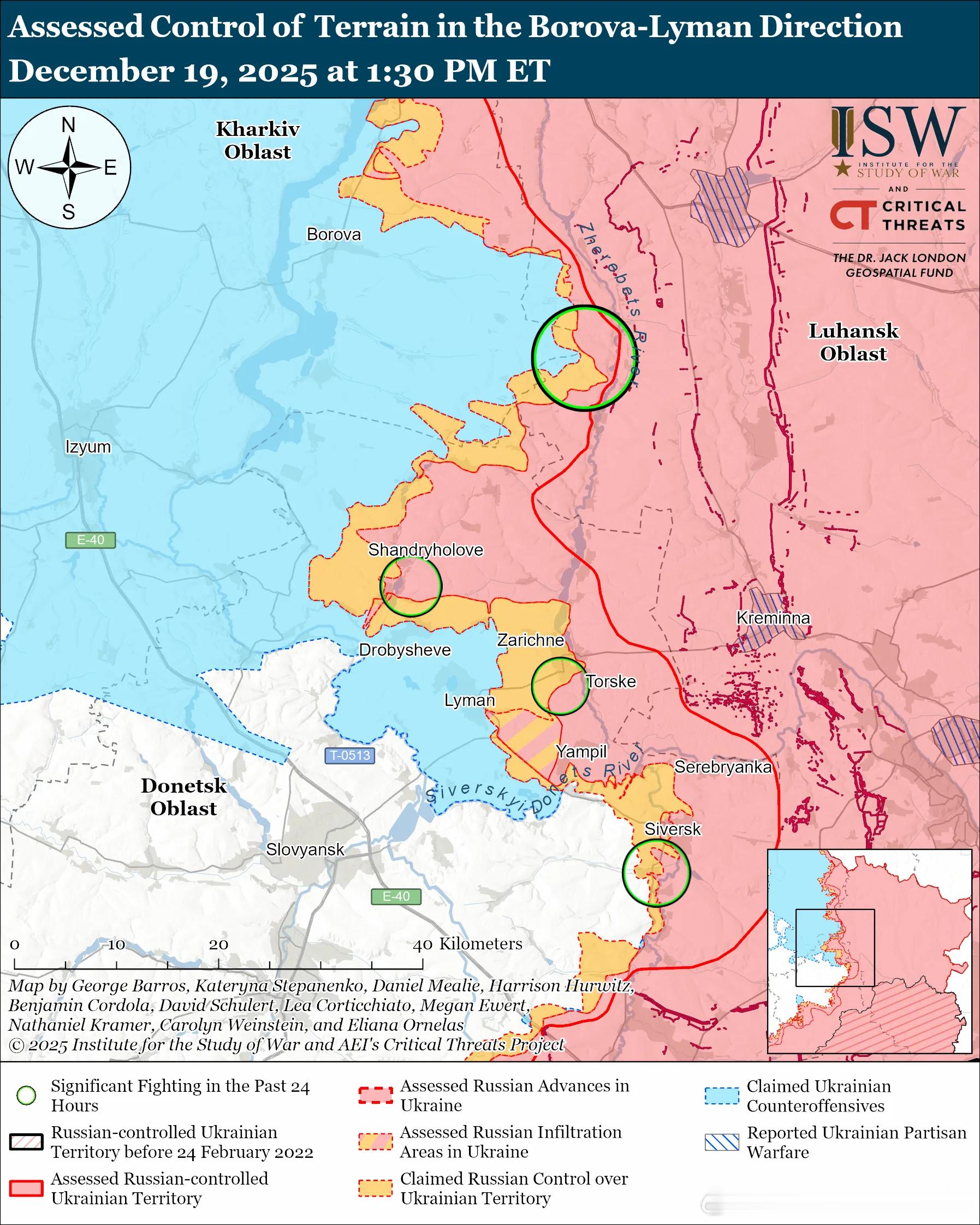 俄军主要行动2俄军目标:占领卢甘斯克州剩余部分,向西推进至哈尔科夫州东部,并包围顿涅茨克州北部。乌克兰军队最近在库皮扬斯克方向推进。俄罗斯声称占领的区域范围:12 月 19 日发布的地理定位视频显示,乌克兰军队在斯捷波瓦-诺沃谢利夫卡(库皮扬斯克东南)西北部保持阵地并推进——此前俄方声称俄军在该地区驻扎。12月18日和19日,俄军在库皮扬斯克附近、库皮扬斯克以东的彼得罗巴甫洛夫卡方向以及库皮扬斯克东南的库里利夫卡和皮什恰内附近和格卢什基夫卡方向发动进攻。俄罗斯军事博客作者声称,乌克兰军队在库皮扬斯克附近进行了反击。12月18日一名在库皮扬斯克方向作战的乌克兰指挥官报告称,俄军向其上级谎报推进情况的习惯影响了俄军在该方向的军事指挥决策,而乌克兰军队则进行了反击。乌克兰军事观察员马绍韦茨报告称,乌克兰军队控制了库皮扬斯克至霍卢比夫卡公路(库皮扬斯克以北)的火力,该公路是俄军的一条地面交通线。一名俄罗斯军事博主声称,泥泞的天气条件使得俄军在该方向难以操作轮式车辆。作战序列:俄第352摩步团(第11军,列宁格勒军区)的无人机操作员正在斯捷波瓦-新谢利夫卡西北部打击乌克兰军队。第68摩步师(第6集团军,列宁格勒军区),包括其第121摩步团和第27摩步旅(第1近卫坦克集团军,莫斯科军区)正在库皮扬斯克及其附近地区作战。乌克兰军队最近在博罗瓦方向推进并维持了阵地。俄罗斯声称占领的区域范围:12 月 18 日发布的地理定位视频显示,乌克兰军队在科利斯尼基夫卡(博罗瓦以北)以东地区活动——此前俄方声称,俄军在该地区保持着存在。12月18日至19日,俄罗斯军队攻击了新普拉托尼夫卡附近的博罗瓦北部和新普拉托夫卡附近的博罗瓦东南部以及切尔沃尼斯塔夫和德鲁热柳比夫卡方向。作战序列:据报道俄第 4 坦克师(第 1 GTA、MMD)正在博罗瓦方向作战。12月19日俄军继续在斯拉维扬斯克-利曼方向发动进攻,但并未取得进展。12 月 18 日和 19 日,俄军向莱曼城本身、莱曼城西北部的德罗比舍韦和尚德里霍洛夫附近、莱曼城北部的斯塔夫基附近、莱曼城东部的扎里奇涅附近以及莱曼城东南部的迪布罗瓦附近发动进攻。乌克兰第三军发言人奥列克桑德·博罗金于12月19日报告称,俄军继续在莱曼方向使用渗透战术,但有时会派遣突击步兵在没有无人机支援的情况下发起攻击。博罗金指出,俄军很少使用机械化车辆,并且继续在雾天发动攻击,这不利于俄乌双方的无人机作战。12月19日在莱曼方向作战的乌军旅发言人报告称,乌克兰军队控制了斯塔夫基(莱曼北部)和新谢利夫卡(莱曼西北部),而俄罗斯国防部声称俄军已于11月21日占领了这两个定居点。该发言人还报告称,大多数俄罗斯军人在部署到前线之前只接受一个月的训练。作战序列:据报道俄第1和第15摩步团(均隶属于第2摩步师、第1大队、MMD)正在乔尔尼·热列别茨河西岸(右岸)向莱曼方向作战。鲁比孔先进无人技术中心的无人机操作员正在向莱曼方向作战。