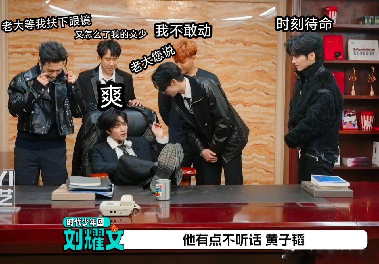 刘耀文把黄子韬赶出时代峰峻 没想到刘耀文真在李飞办公室为所欲为起来了!宇宙闪烁请注意 在时代峰峻,刘耀文背靠老板椅,翘起个二郎腿俨然一副大佬姿态,宇宙爆闪团的几位哥哥像小弟一样围在他身边,超大声的一句“黄子韬!”吓得韬哥虎躯一震,又来一句“他有点不听话”,王鹤棣立马抓住黄子韬衣领拖着他就往外走,邵子恒、于洋几个开团秒跟,就这样,黄子韬被抬出了李飞办公室,黄子韬那句委屈的“我哪有不听话”显得苍白又无力!哈哈哈原来刘耀文在重庆就是这么照顾哥哥的!