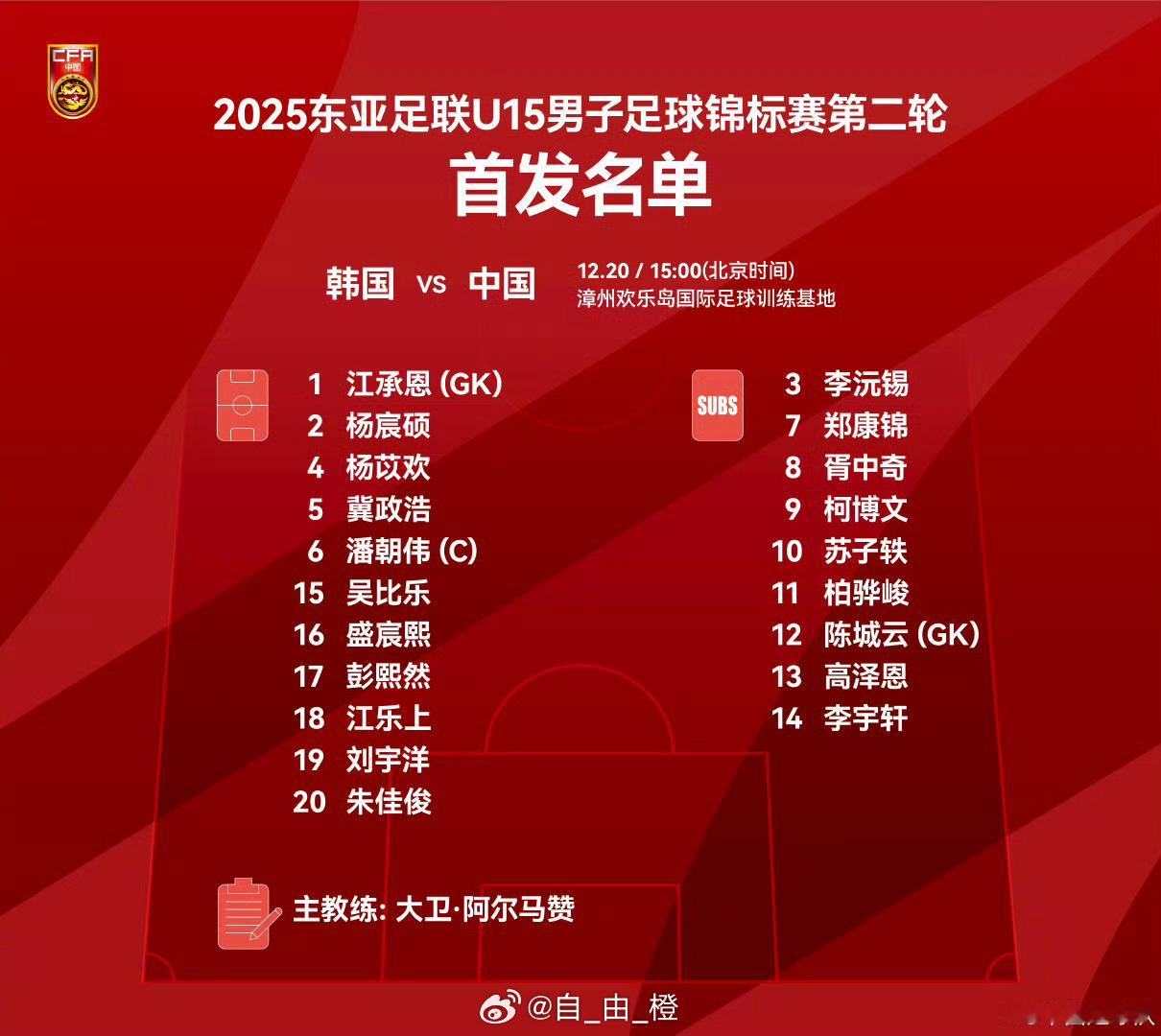 2025亚足联U15男子足球锦标赛第二轮,中国队VS韩国队首发阵容。