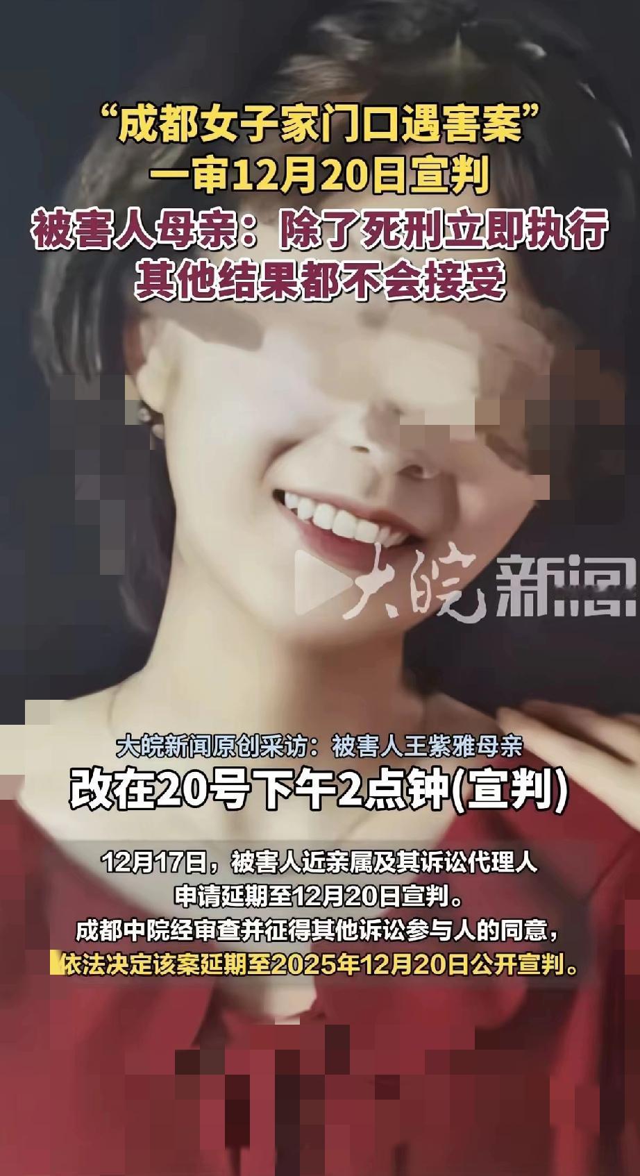 成都27岁女孩家门口遇害,一审死缓判决真的让人意难平! 凶手带着预谋的刀具上门,连刺十刀夺走一条鲜活生命,庭审上逻辑清晰、态度嚣张,却凭着案发后出的精神鉴定获轻判。 最让人无法接受的是,这所谓的“精神分裂症”,案发前没有任何确诊记录,邻居和小区都没人见过她有异常,鉴定依据全是家人说辞。 精神鉴定本是司法公正的标尺,不该变成凶手脱罪的“救命符”。 当有预谋的杀人能靠一纸事后鉴定减轻惩罚,不仅对不起逝者,更会让法律的威慑力打折扣。 真正的公平,是不让受害者白白牺牲,不让“精神病”成为恶意犯罪的挡箭牌。 你觉得这样的判决合理吗?成都紫雅案