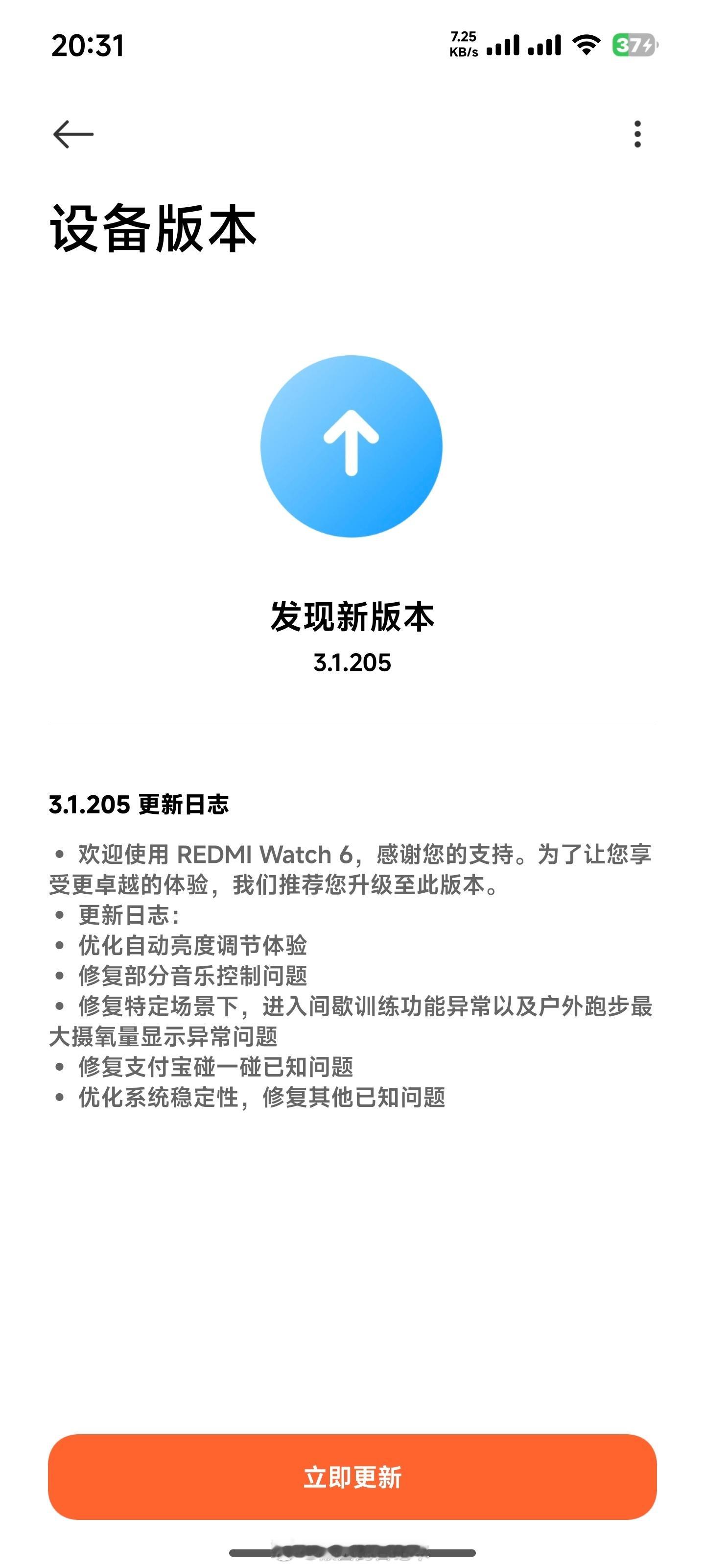 REDMI Watch 6推送固件更新ver 3.1.205有REDMI Watch 6的小伙伴可以去更新了更新日志:·优化自动亮度调节体验·修复部分音乐控制问题·修复特定场景下,进入间歇训练功能异常以及户外跑步最大摄氧量显示异常问题·修复支付宝碰一碰已知问题·优化系统稳定性,修复其他已知问题REDMIWatch6小米澎湃OS3