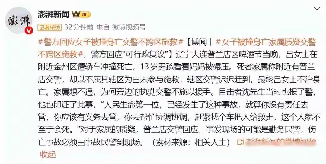 对死者表示同情,如果警察有不履职的问题也要问责。但同时也有个疑问,女子交通事故中受伤应该救护车才能施救,警察只是维持交通秩序,或者对事故进行认定,警察即使帮忙能救人吗?如果用警车送患者到医院,不是专业医护人员感动躺在地上的患者吗?万一由于搬动造成了伤情扩大或者最终患者死亡,搬动患者的警察是不是要承担相应责任?这些问题不解决,普通民众还是不敢胡乱救人的,毕竟已经发生过不懂医疗常识的人搬病人,造成骨折或其他严重问题的发生现象。