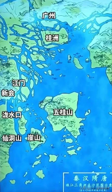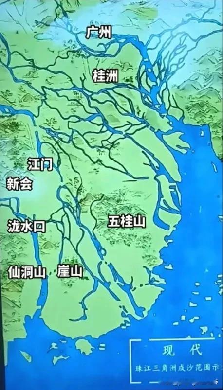 古今2000年珠江三角洲地形图的变迁。在隋唐时期,今天的珠江三角洲平原很多地方还是一片汪洋。在经过了几千年江河的冲沙沉淀之下,也就形成了大片的冲击平原和肥沃的土壤。人们在此繁衍生息,也就诞生了珠江三角洲的这一大片的人口居住地。如今这里也成为了全国经济较为发达的地区之一。