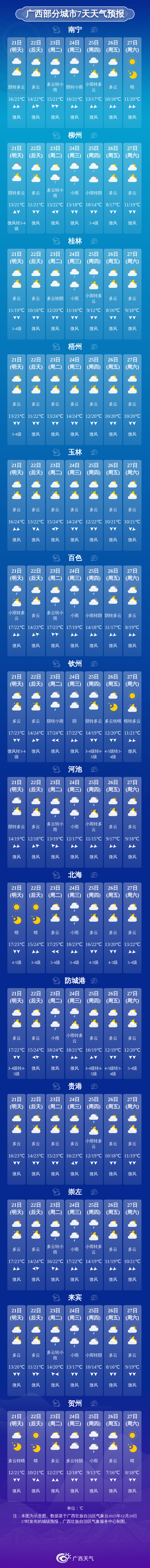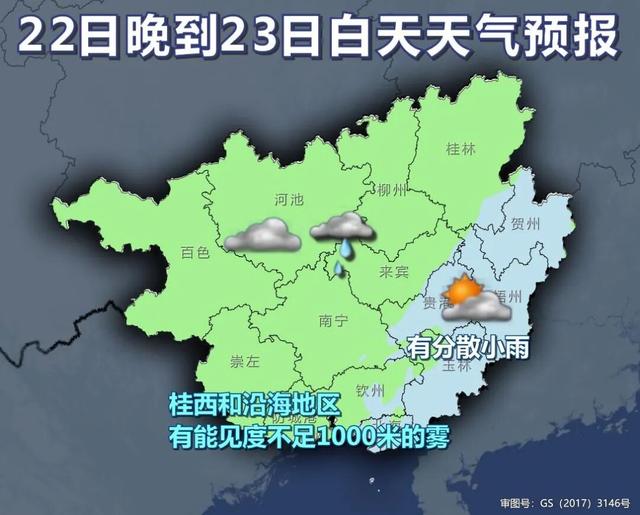 22日晚上到23日白天,桂北、桂西阴天有小雨,其它地区多云有分散小雨。桂西和沿海地区有能见度不足1000米的雾。