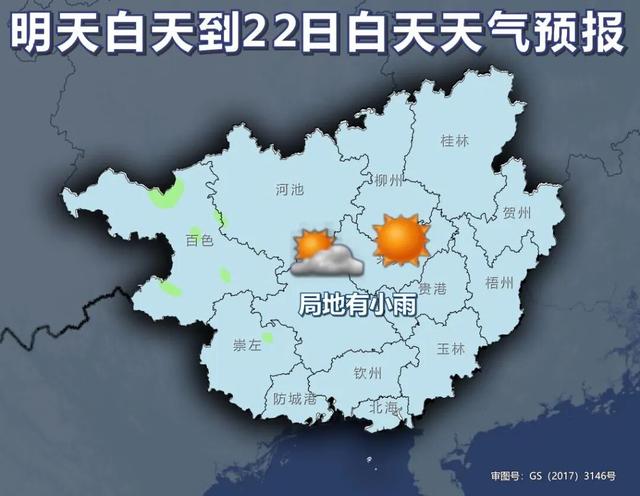 明天白天到22日白天,全区多云间晴、局地有小雨。