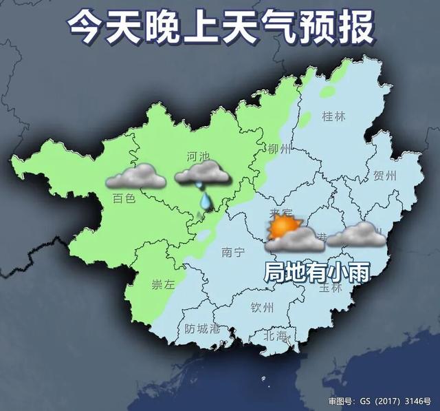 今天晚上,柳州、河池、百色、崇左等市阴天有小雨,其它地区多云到阴天、局地有小雨。