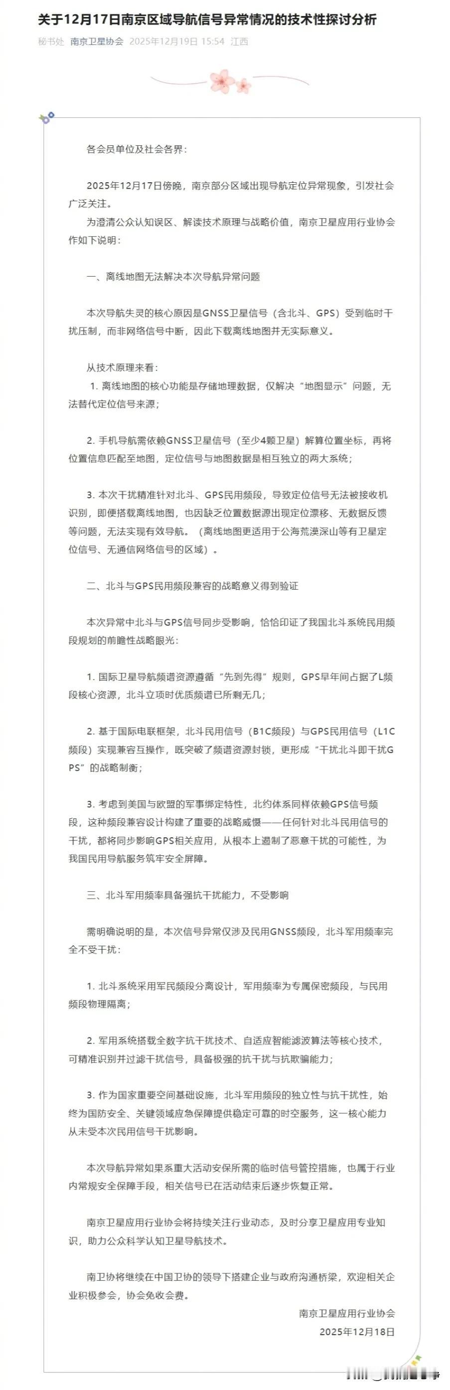 南京这次卫星信号丢失的事件,有可能是在进行压力测试。 以突然袭击的方式测试一下民用导航网络跟军方的网络他们的可靠性。 目前看军方的网络是非常稳定可靠的。 而民用的网络简单的维护一下也很快恢复了秩序。 其实出点小问题也是好事儿。 小问题出来了就给了咱们修修补补的机会。 不怕问题冒头,就怕问题被雪藏啊。