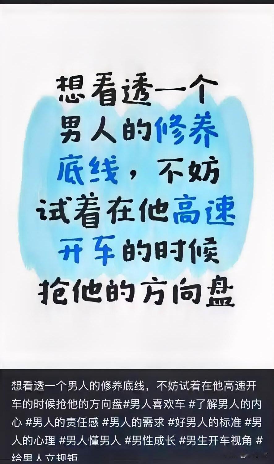 多么毒的鸡汤啊!想看透-一个男人的修养底线,不妨试着在他高速开车的时候抢他的方向盘! 这是多少年脑血栓和高血压才能想出来的绝妙方法! 且不说高速路上抢对方方向盘就等于谋杀! 这种行为本来就是愚昧无知的! 就说还有你用这种方法试探男人,想超大什么想法? 男人把方向盘给你?就是爱你? 醒醒吧!