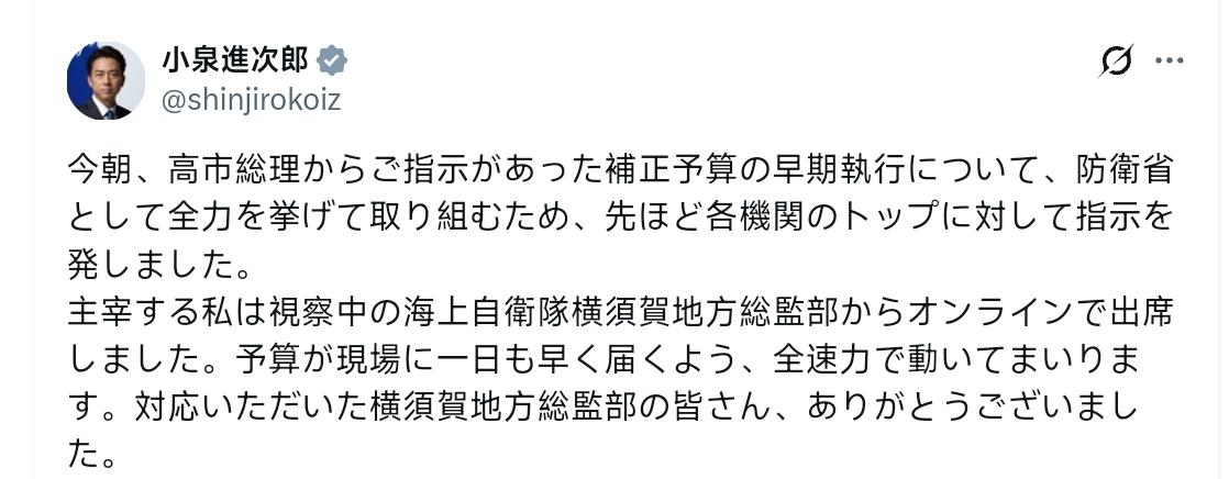 日本防卫大臣小泉进次郎:今早,高市总理就补充预算的早期执行下达了指示,为此防卫省将全力以赴推进,刚才我已向各机构负责人发出了指示。作为主持人的我,正在视察中的海上自卫队横须贺地方总监部,通过线上方式出席了会议。将全力以赴,让预算尽快一天送到现场。感谢横须贺地方总监部的各位提供的协助。