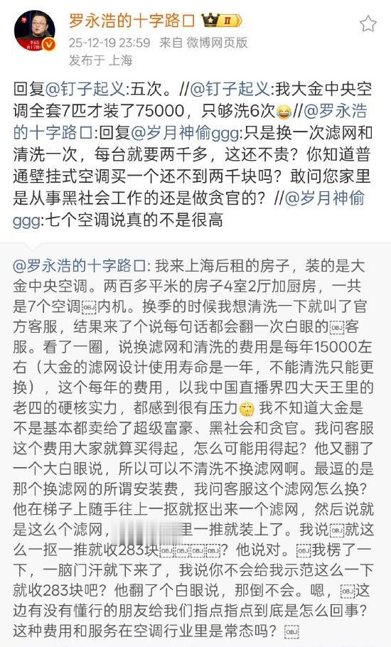 他表示:我来上海后租的房子,装的是大金中央空调。两百多平米的房子4室2厅加厨房,一共是7个空调内机。换季的时候我想清洗一下就叫了官方客服,结果来了个说每句话都会翻一次白眼的客服。看了一圈,说换滤网和清洗的费用是每年15000左右(大金的滤网设计使用寿命是一年,不能清洗只能更换),这个每年的费用,以我中国直播界四大天王里的老四的硬核实力,都感到很有压力。