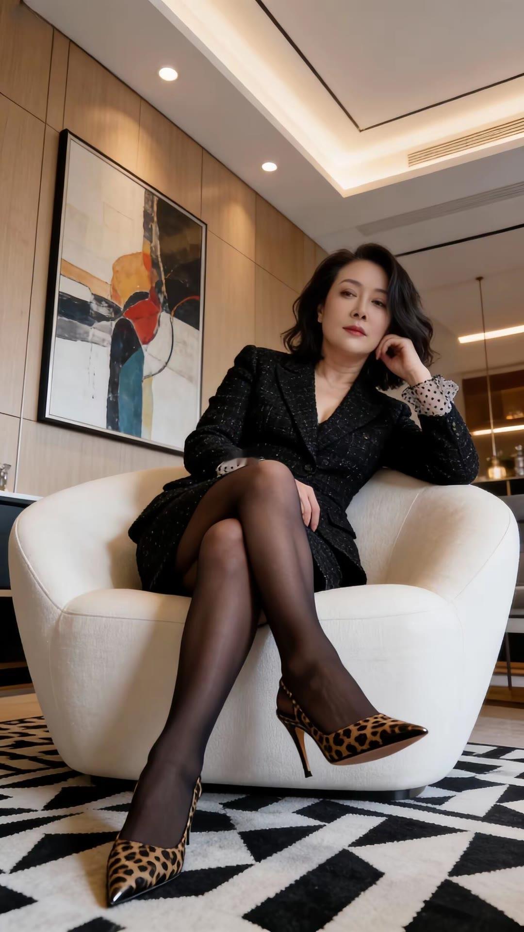 分享美女穿搭服饰这几张图片呈现出成熟御姐风的职场穿搭场景,人物身着黑色小香风套装,搭配波点袖口、黑丝与豹纹高跟鞋,干练中透着妩媚;背景是现代简约的室内空间,冷调的灰色木饰面、几何地毯与金属椅子营造出高级的都市精英氛围,小香风粗花呢材质、豹纹高跟鞋的点缀让整体搭配既正式又富有女性魅力。轻奢女职业装 高端小香风穿搭 职场女高管穿搭