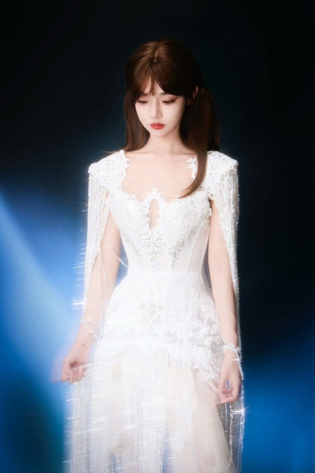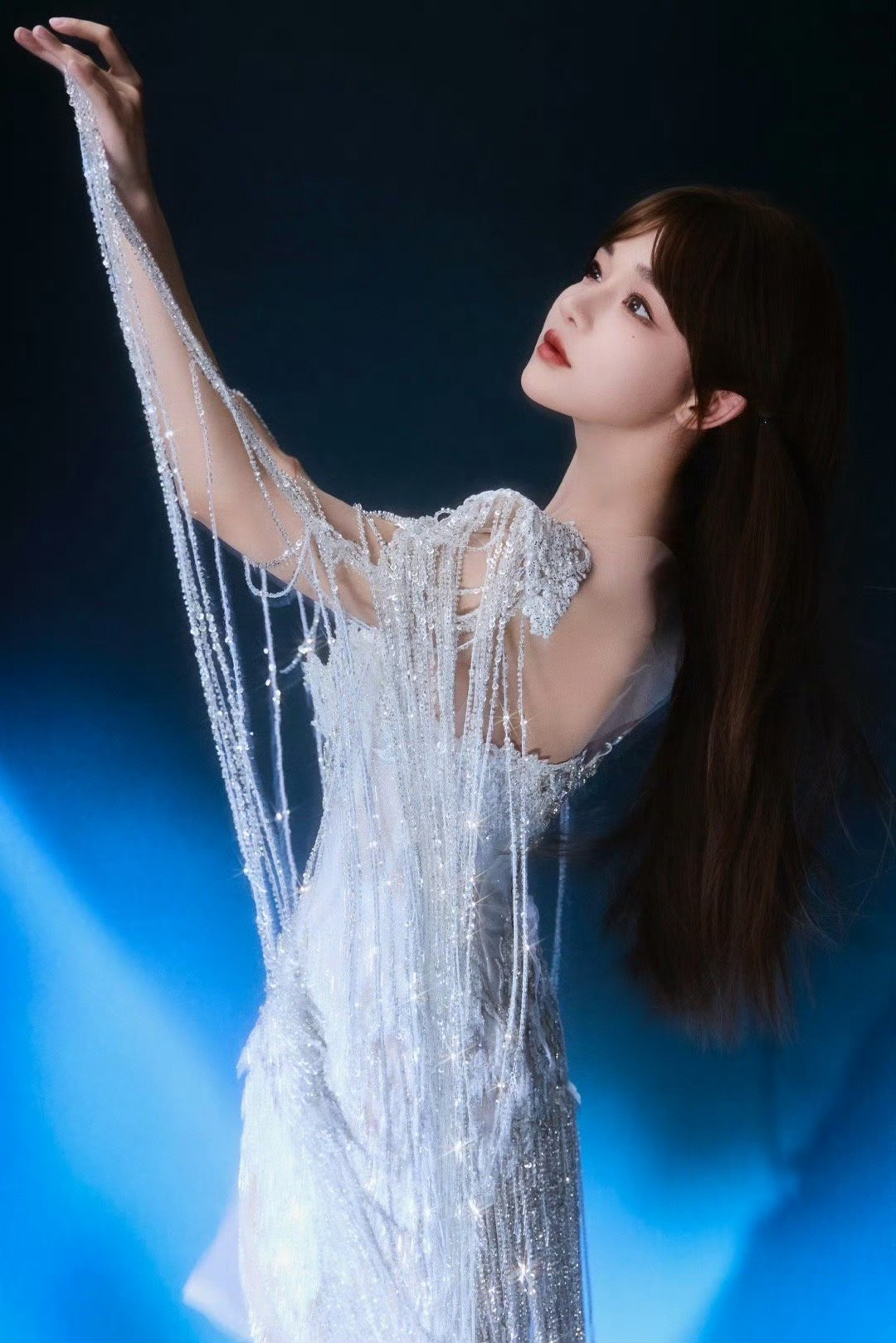 黄霄雲居然把水晶穿在身上 这造型堪称艺术!黄霄雲将万千水晶化作流苏战袍,随着歌声轻盈摇曳,在蓝色光影中闪闪发光。又仙又飒,完美诠释了何为“声形合一”的舞台魅力。