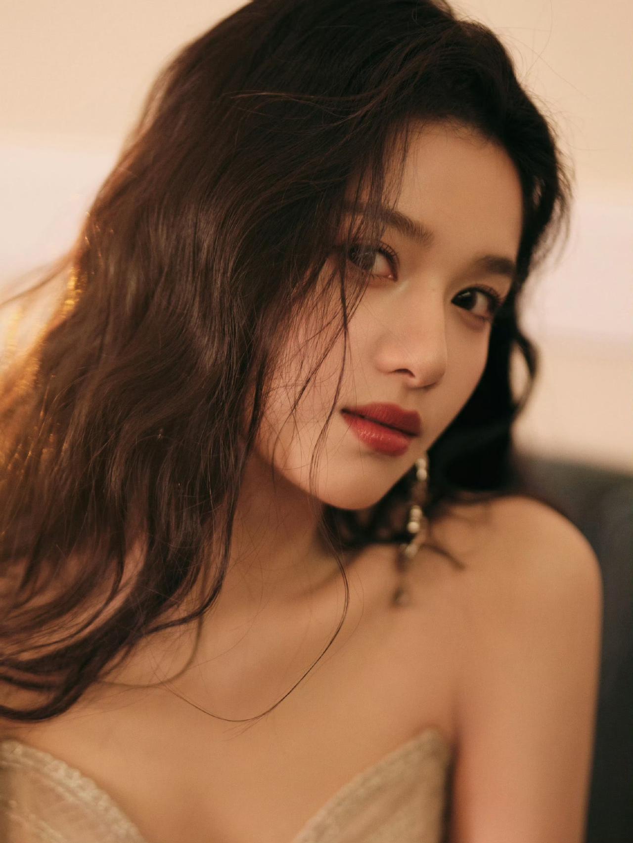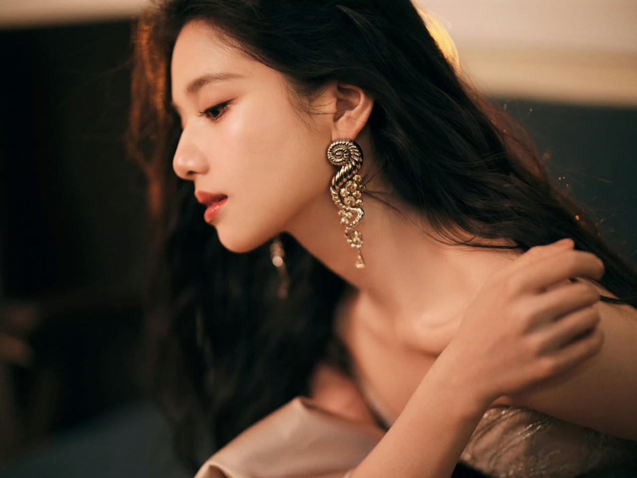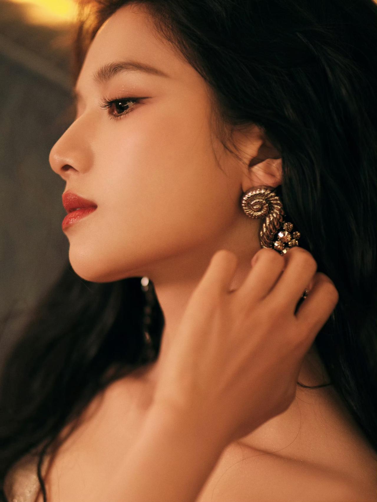 优雅红唇,复古耳环,温柔光影下的迷人女子张婧仪!