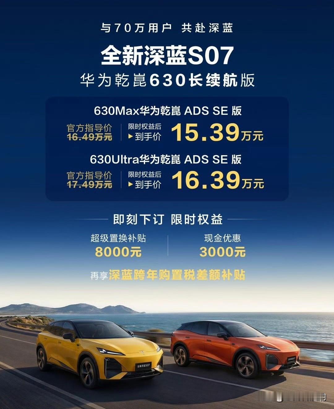 让我万万没想到,2025年12月,深蓝品牌历史累计总交付量突破了70万辆大关,达成了重要的里程碑!而全新深蓝S07华为乾崑630长续航版也来了,限时售价仅需15.39万元起!一起来看看这款车。 坐进车里,第一感觉就是“宽敞又舒服”!2900mm的轴距让1米8身高的人调好驾驶位,后排腿部还有三拳多空间,跷二郎腿完全没问题。后排地板是纯平的,中间坐人脚不用蜷着。主驾座椅能16向电动调节,还带加热和按摩。 15.6英寸的中控屏能左右旋转15度,开车看导航,副驾座转过去追剧,可以互不干扰。语音控制特别灵,支持四音区识别。55英寸的AR-HUD很实用,车速、导航路线都投在前挡风上,安全感满满。 最让人踏实的还是续航和驾驶体验!CLTC纯电630公里的续航,平时通勤每天50公里,一周充一次电就够了,完全不用天天找充电桩。3C超快充也给力,15分钟就能从30%充到80%,中途歇脚买杯咖啡的功夫就补满电了。华为智驾系统在市区通勤超好用,拥堵路段能自动跟车、预判加塞。底盘调校也偏向舒适,过坑洼路面时,颠簸过滤得很好。 如果你对这款车感兴趣,可以去经销店实地体验试驾一下,说不定你会有惊喜。