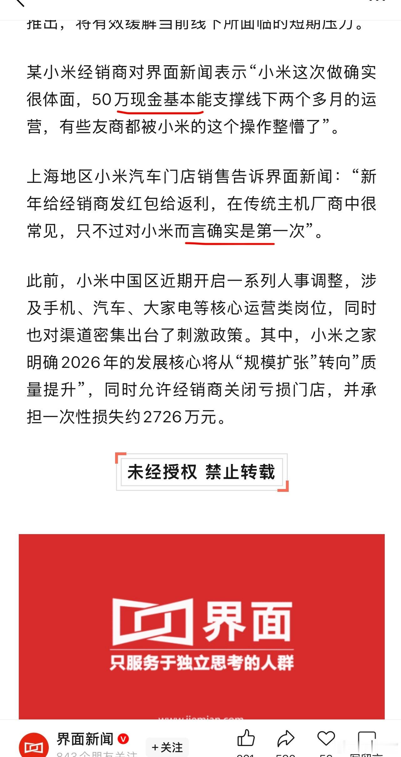 给汽车经销商发超一亿元红包小米汽车在负面舆论下,部分经销商零售门店出现了经营性亏损。为解决经销商亏损问题,年末小米给经销商发了超一亿元红包。小米汽车有些带新车销售和售后服务的交付中心由传统4S店改造而来,品牌对人员配备数量、试驾车数量的高规格配置要求,带来较高运营成本;另一方面,负面舆论持续发酵致使门店销量和盈利锐减,并且导致店内销售人员,直播人员出现了流失;值得注意的是,小米汽车经销商投资人整体实力相对有限,若无补贴托底,经销商经营将难以为继,甚至对品牌声誉产生负面影响。 在这种情况下,对刚刚进入汽车市场小米来说,稳定渠道才能维持正常的销售运营,给经销商发补贴是最可行的办法。一亿元补贴,在汽车行业中都算不上什么钱,不过作为新势力品牌给经销商发补贴,这个就是算是一个新鲜事儿了。同样作为新势力品牌,问界门店由于盈利较强,单靠销售新车就有上千万利润。桑之未汽车行业观察