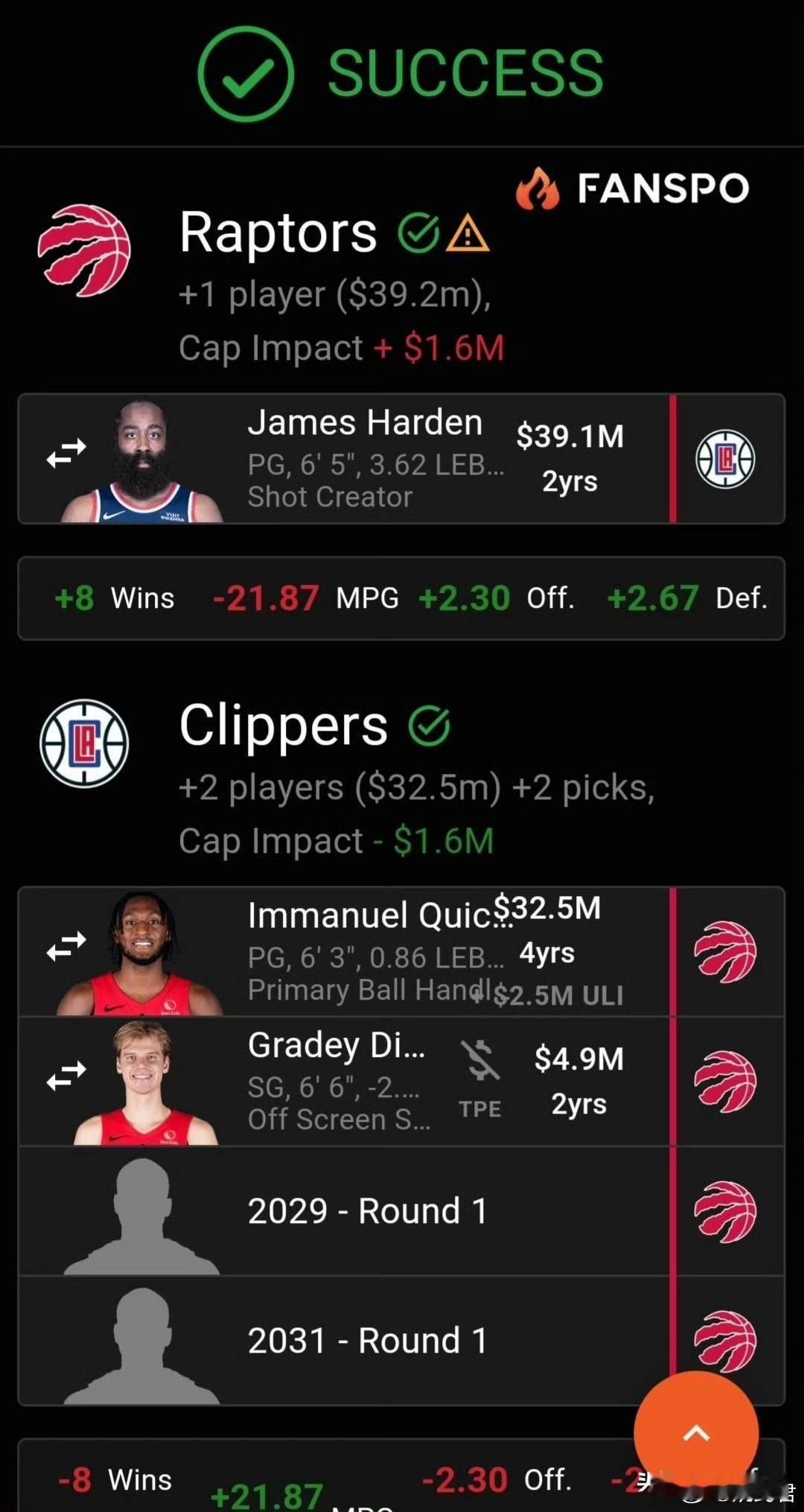 美媒最新哈登交易方案:远赴猛龙! 今天,美媒又列出了一套哈登的交易方案。猛龙队送出新星奎克利、迪克再加上2029年和2031年两个首轮,得到哈登。相信两名出色的新星再加上两个首轮的报价足够打动快船管理层。而猛龙队得到哈登以后,在东部也可以闯出一番天地。哈登、英格拉姆、巴恩斯、巴雷特和帕尔特尔的首发组合足够有竞争力。
