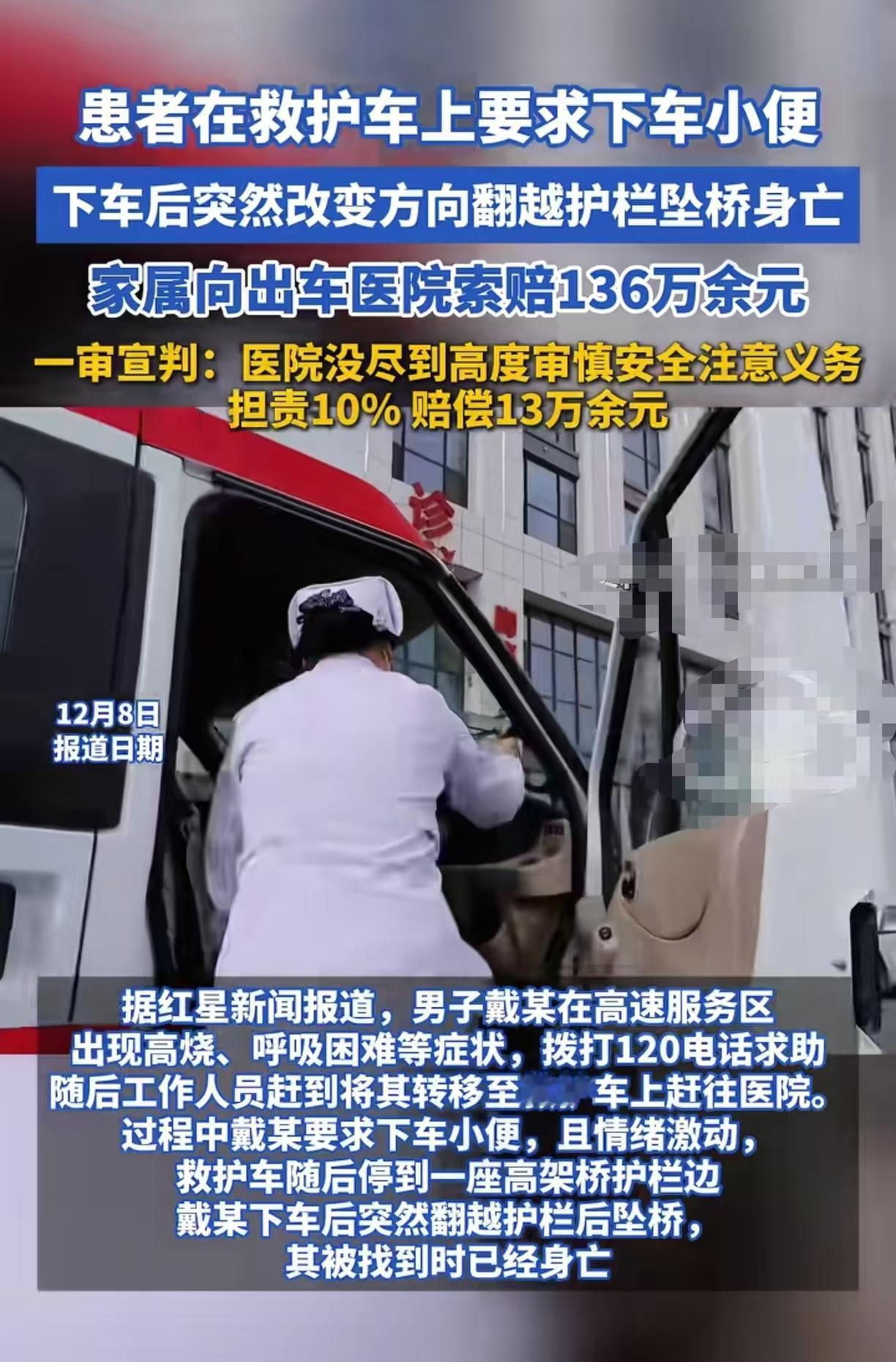 一线从业人员太难了!救护车如果不停车不让戴某下车小便又会被人说没人性,现在停车让他下车,他自己坠桥身亡家属又起诉人家,索赔136万元,这算“天价赔偿”了吧? 还好法院酌情判了医院只承担10%的责任,赔了13万元,而不是家属索赔的136万! 据九派新闻报道,患者救护车上要求下车小便,高速禁行区下车后坠桥身亡,医院一审被判赔13万余元。 这事发生在2024年8月3日,男子戴某在高速服务区出现高烧抽搐,呼吸困难症状,拨打120求助,120工作人员赶到后将其转移至救护车上并赶往医院,但过程中戴某要求下车小便且情绪激动。救护车随后停到一座高架桥护栏边,戴某下车后突然翻越护栏后坠桥,其被找到时已经身亡。 戴某家人认为,医务人员不应让已神志不清的患者独自下车,起诉出车的旬阳市某医院,索赔136万余元。 医院辩称,戴某当时神志清醒,且对随车人员进行人身攻击,强行要求停车后下车跳桥死亡,系自杀,医务人员无法预见。 旬阳市人民法院一审酌情确定,医院对戴某的死亡后果承担10%的责任较为合理,判决该医院赔偿13万元。 说实话,我希望医院提起抗诉,感觉这事不管随车医护人员怎么做都不对。看完这起新闻,突然觉得很多医疗行业看似不合理又不近人情的规定,都是因为这类人太多了,医务人员的惨痛经验和代价换来的! 就说这事吧,你说医护人员能硬拉着不让病人去上厕所吗?他能提出这个要求,还能说他神志不清?就算你不让他上厕所,给他插尿管,我想他还是有别的办法喊你停车。 就像网友们说的“闹吧闹吧,以后该插尿管插尿管,该穿尿不湿就穿尿不湿”,再出台个什么新规,吃苦的还是后来人啊!