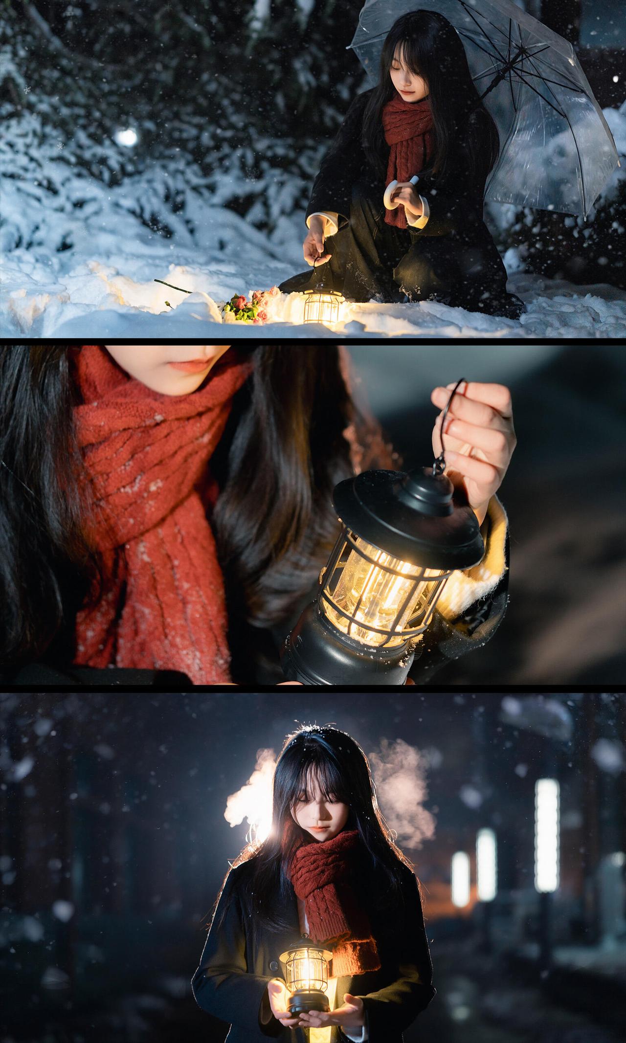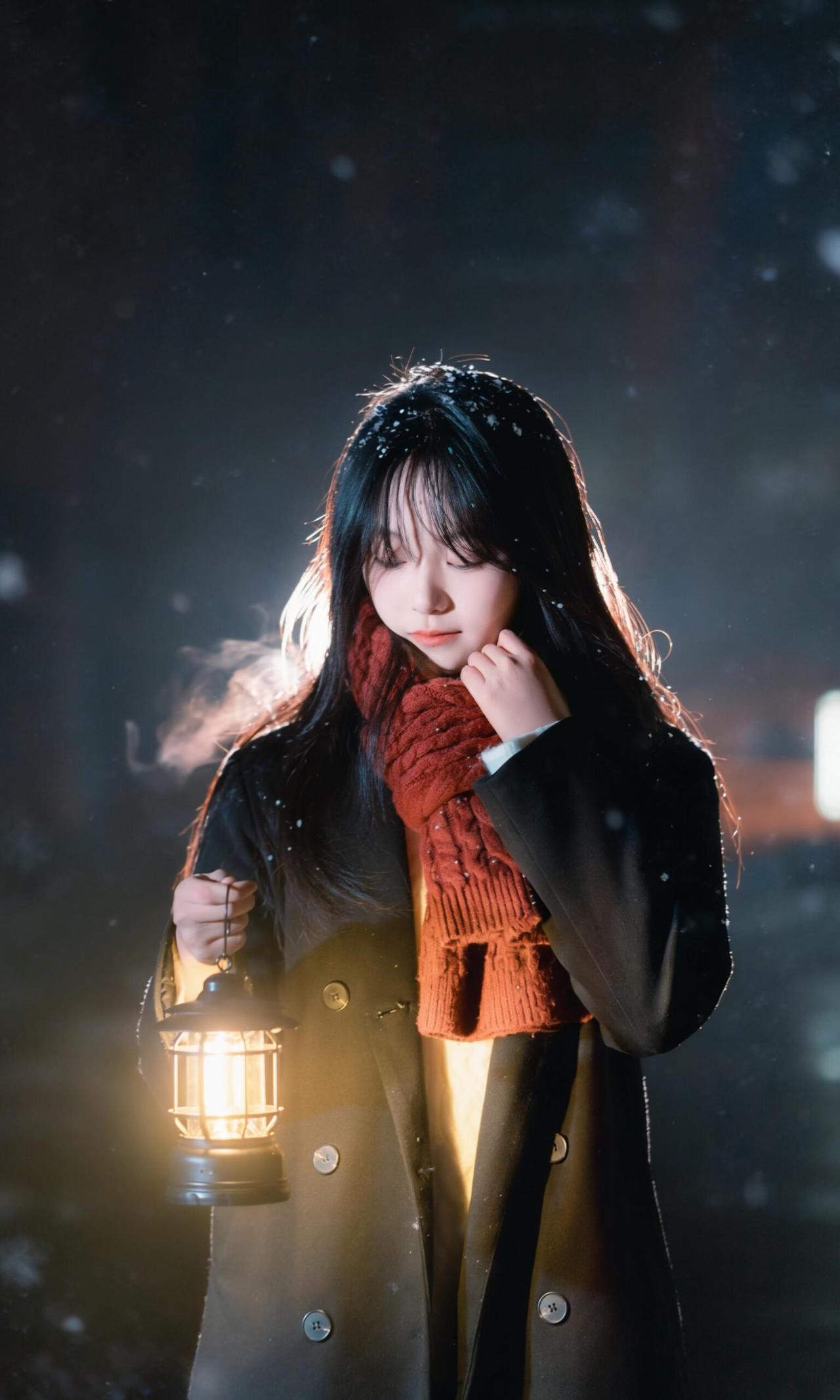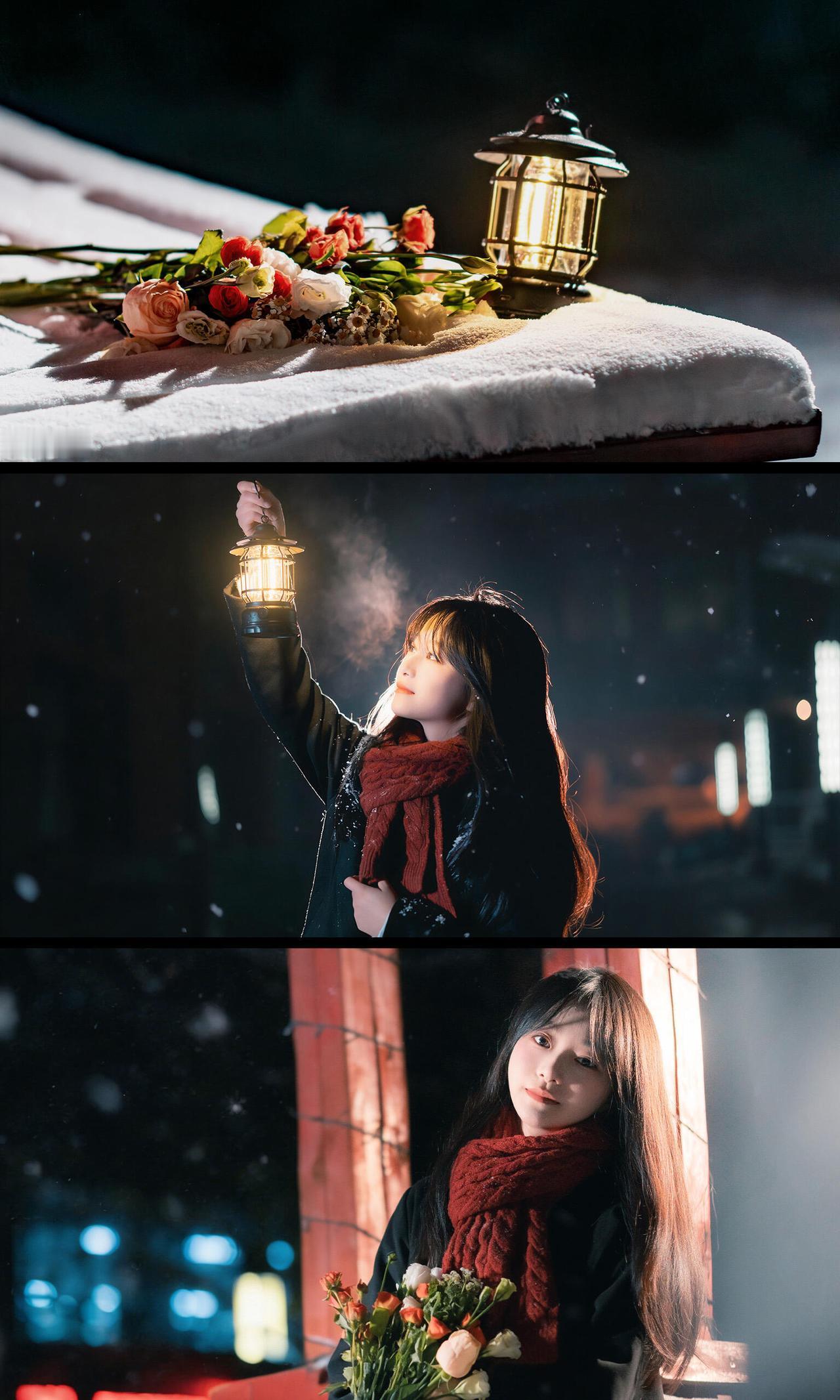 光影处理是这组作品的核心亮点,侧逆光与人工补光的结合,完美塑造了雪夜人像的立体感。在人物手持马灯的特写镜头中,暖光从下至上打亮面部,弱化了雪地的冷调对人物肤色的影响,同时让飘落的雪花在光线下形成清晰的光斑,营造出梦幻的圣诞雪夜氛围;背景的暗调处理则最大化突出了人物主体,让暖光区域成为视觉中心,符合圣诞人像“暖调核心”的审美逻辑。晒图笔记大赛 构图上,作品采用了多种景别搭配,全景展现雪夜环境,中景捕捉人物与道具的互动,特写聚焦面部情绪,形成了丰富的视觉节奏。但部分构图存在失衡问题,如蹲坐镜头中人物偏居画面右侧,左侧雪地留白过多且无视觉元素填补,导致画面重心偏移;站立镜头中人物头顶的空间预留不足,产生压抑感。若运用三分构图法调整人物位置,或利用前景的树枝、栏杆等元素填补留白,能让构图的均衡性与美感进一步提升。