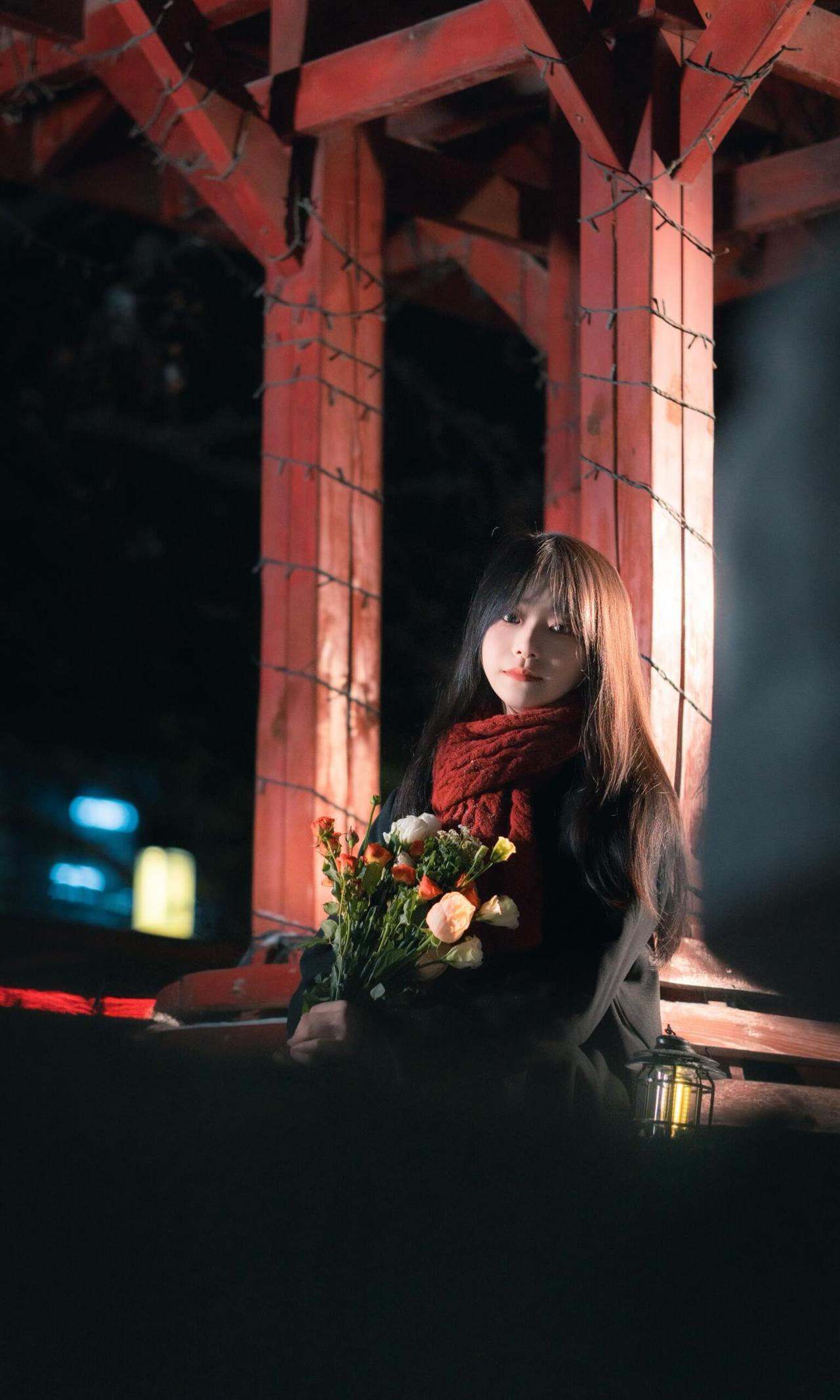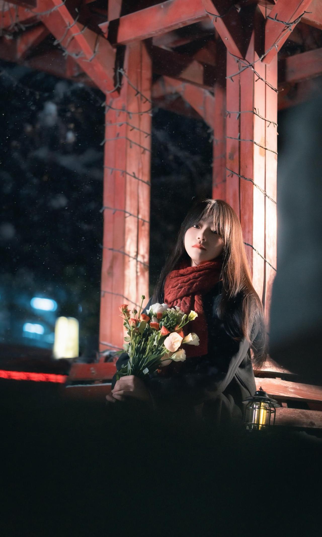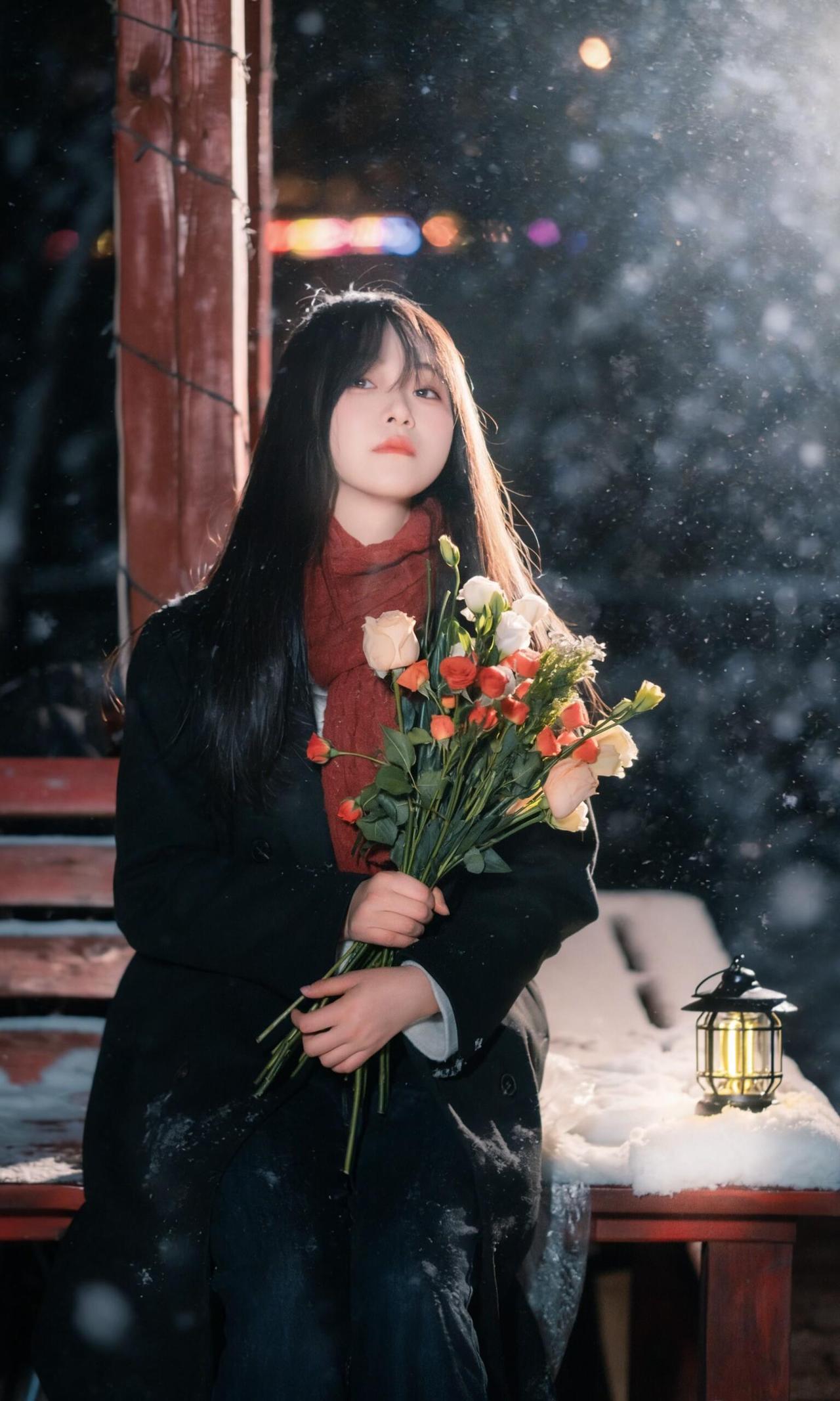 光影处理是这组作品的核心亮点,侧逆光与人工补光的结合,完美塑造了雪夜人像的立体感。在人物手持马灯的特写镜头中,暖光从下至上打亮面部,弱化了雪地的冷调对人物肤色的影响,同时让飘落的雪花在光线下形成清晰的光斑,营造出梦幻的圣诞雪夜氛围;背景的暗调处理则最大化突出了人物主体,让暖光区域成为视觉中心,符合圣诞人像“暖调核心”的审美逻辑。晒图笔记大赛 构图上,作品采用了多种景别搭配,全景展现雪夜环境,中景捕捉人物与道具的互动,特写聚焦面部情绪,形成了丰富的视觉节奏。但部分构图存在失衡问题,如蹲坐镜头中人物偏居画面右侧,左侧雪地留白过多且无视觉元素填补,导致画面重心偏移;站立镜头中人物头顶的空间预留不足,产生压抑感。若运用三分构图法调整人物位置,或利用前景的树枝、栏杆等元素填补留白,能让构图的均衡性与美感进一步提升。