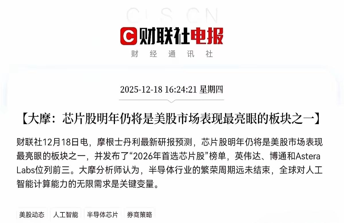 大摩又发表了言论,芯片股明年仍将是美股市场表现最亮眼的板块,明年芯片行业依然是重