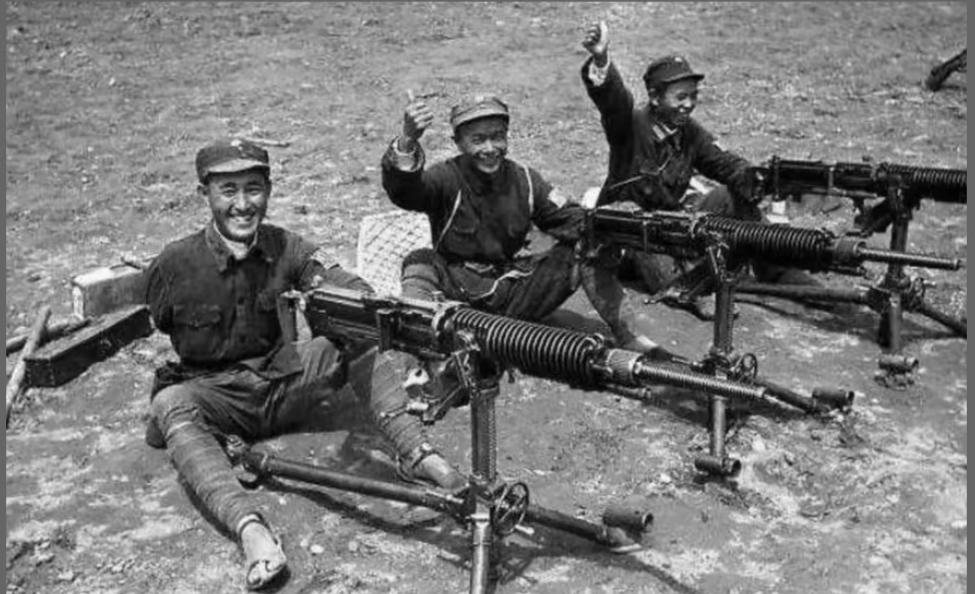 1944年,三位将领年轻时延安的一张珍贵影像。左一,英勇的33岁的断臂八路军就是左齐将军。中间是挺拔的32岁的刘转连,右侧则是儒雅的34岁的陈外欧。三位八路军机枪手,后来分别成为少将,中将,上将。照片中,他们在三挺缴获的战利品前一字排开,抗战中负伤截肢的左齐,刘转连,陈外欧,高兴地手扶战利品,意气风发。他们穿着八路军臂章的军装,打着绑腿,穿着草鞋,其中的刘转连,陈外欧面对镜头手做起必胜的手势,正是当时我国军民面对盟军经常给出的“顶好”的手势,照片充满着自信和乐观的氛围。 此时在延安的八路军有一个共同点,就是大家身材都偏瘦,但是精神状态饱满,斗志昂扬。他们的笑容至今仍熠熠生辉!
