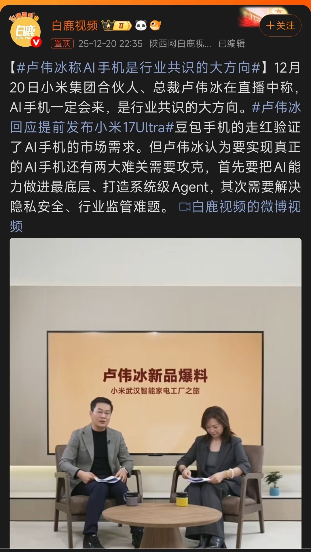 卢伟冰称AI手机是行业共识的大方向Ai手机最大的问题不在于技术,而在于怎么让各种app同意交出控制权。大量app都是靠卖流量卖广告盈利,Ai手机可以让用户不必浏览广告就能完成下单、购物等操作,等于直接断了app的收入,人家肯定不同意。