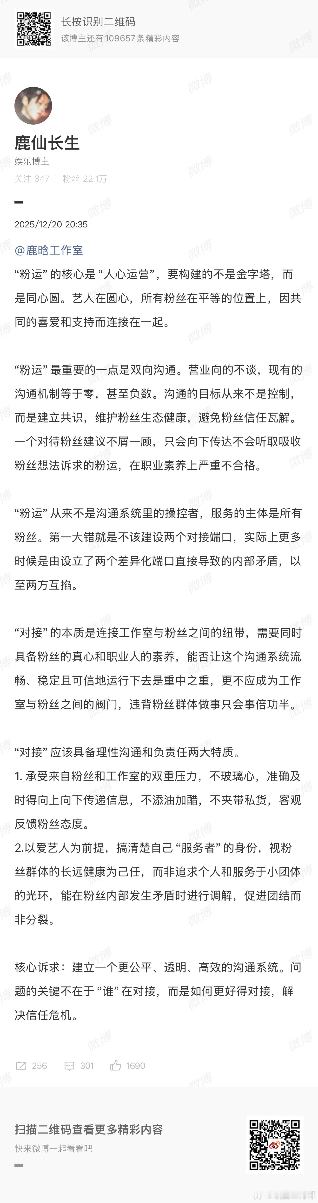 鹿晗粉丝要求工作室正视粉丝诉求:建立一个更公平、透明、高效的沟通系统。问题的关键不在于“谁”在对接,而是如何更好得对接,解决信任危机。