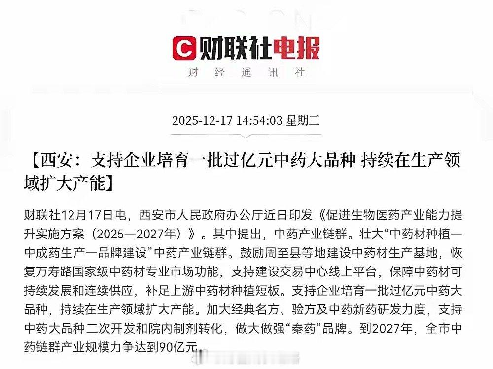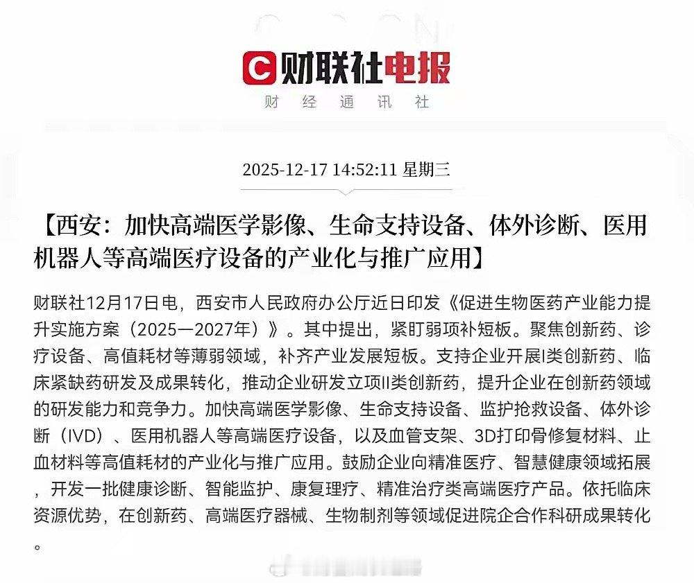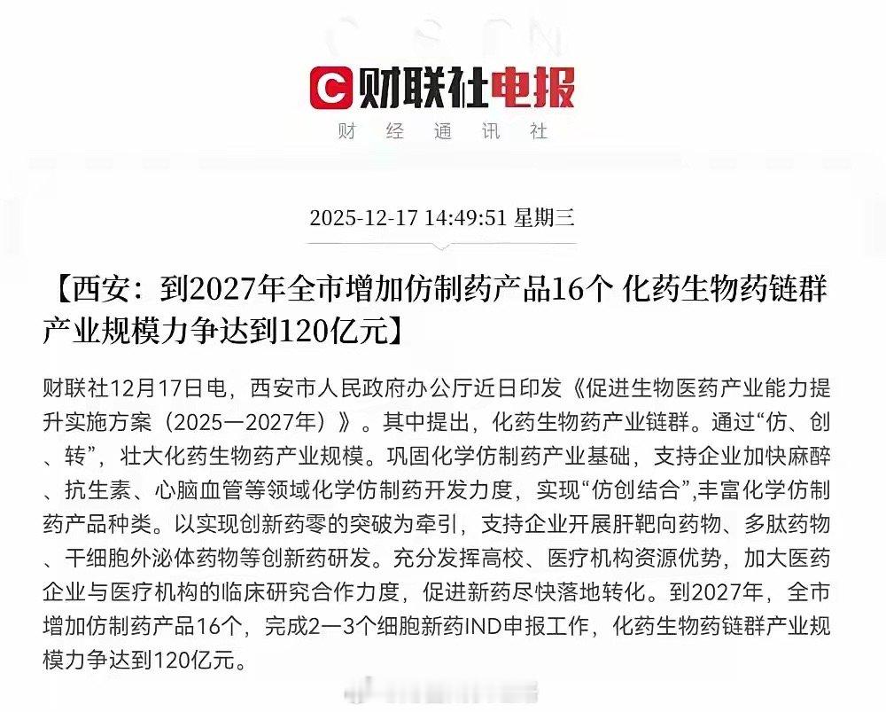 利好来了!利好来了!西安发布重磅利好消息!下午刷到西安刚印发的《促进生物医药产业能力提升实施方案(2025-2027年)》,仔细看了看,确实是给医药板块送“及时雨”。方案里重点提了三块:到2027年要新增16个仿制药,化药生物药规模冲120亿;支持中药企业培育过亿大品种、扩产能;还要加速高端影像设备、医用机器人这些“硬科技”医疗器械的产业化。咱们老股民都懂,医药板块这两年波动大,涨涨跌跌让人有点“心慌”。但西安这政策不是空喊口号,目标具体、领域明确,短期肯定能提振市场情绪,尤其是本地医药股明天估计要“活跃”起来;长期看更关键——产业集群一旦形成,资源、人才、企业都会往这儿聚,慢慢就能冒出龙头企业,整个产业链都能跟着受益。说句实在话,医药是刚需,创新和产能升级又是大趋势。西安这步棋走得稳,既给股民吃了“定心丸”,又给产业打了“基础桩”。持有相关股票的朋友这回能松口气了;没上车的也别急,先观察市场反应,产业基本面扎实了,机会肯定不止这一波。