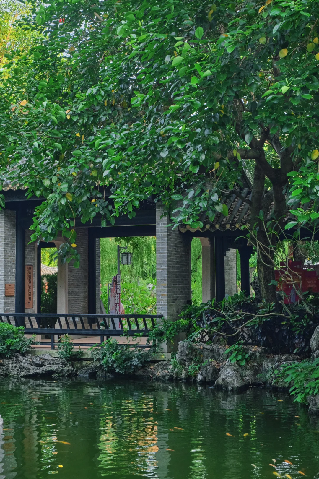 这里是明清风格的岭南建筑,由三进式书院建筑及庭院式建筑构成。庭院内湖、长廊、英石假山、流水等元素,曲径通幽,假山玉池与古树相映