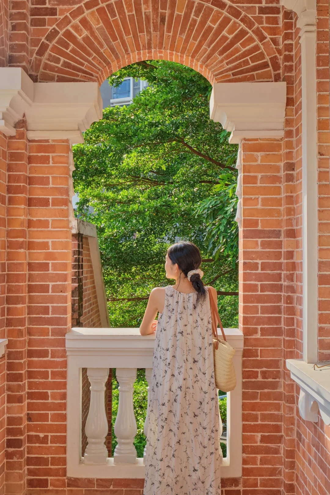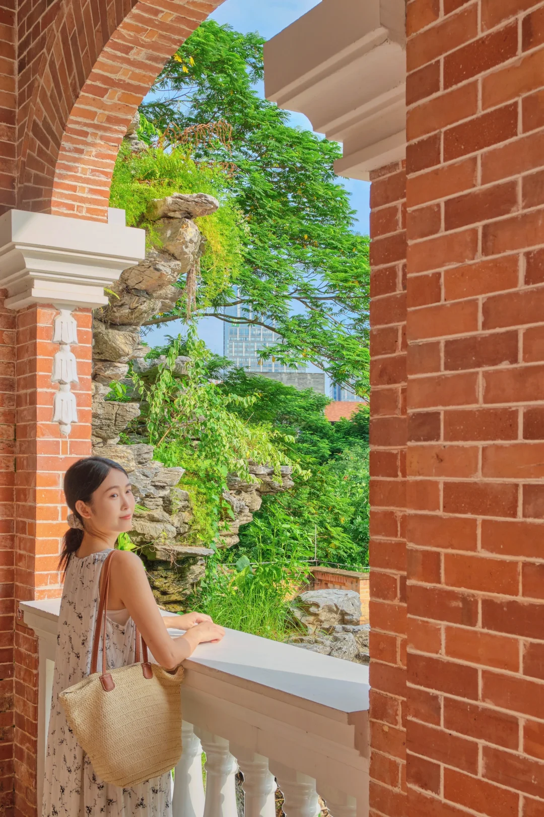 红砖墙+绿色琉璃顶的民国建筑,中西、传统与现代交融。庭院内假山叠石如天女散花,溪流瀑布从三楼倾泻