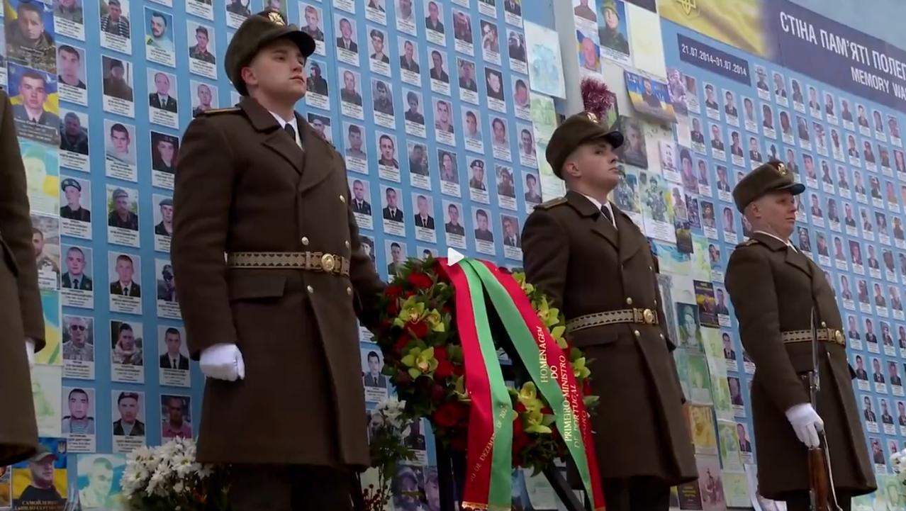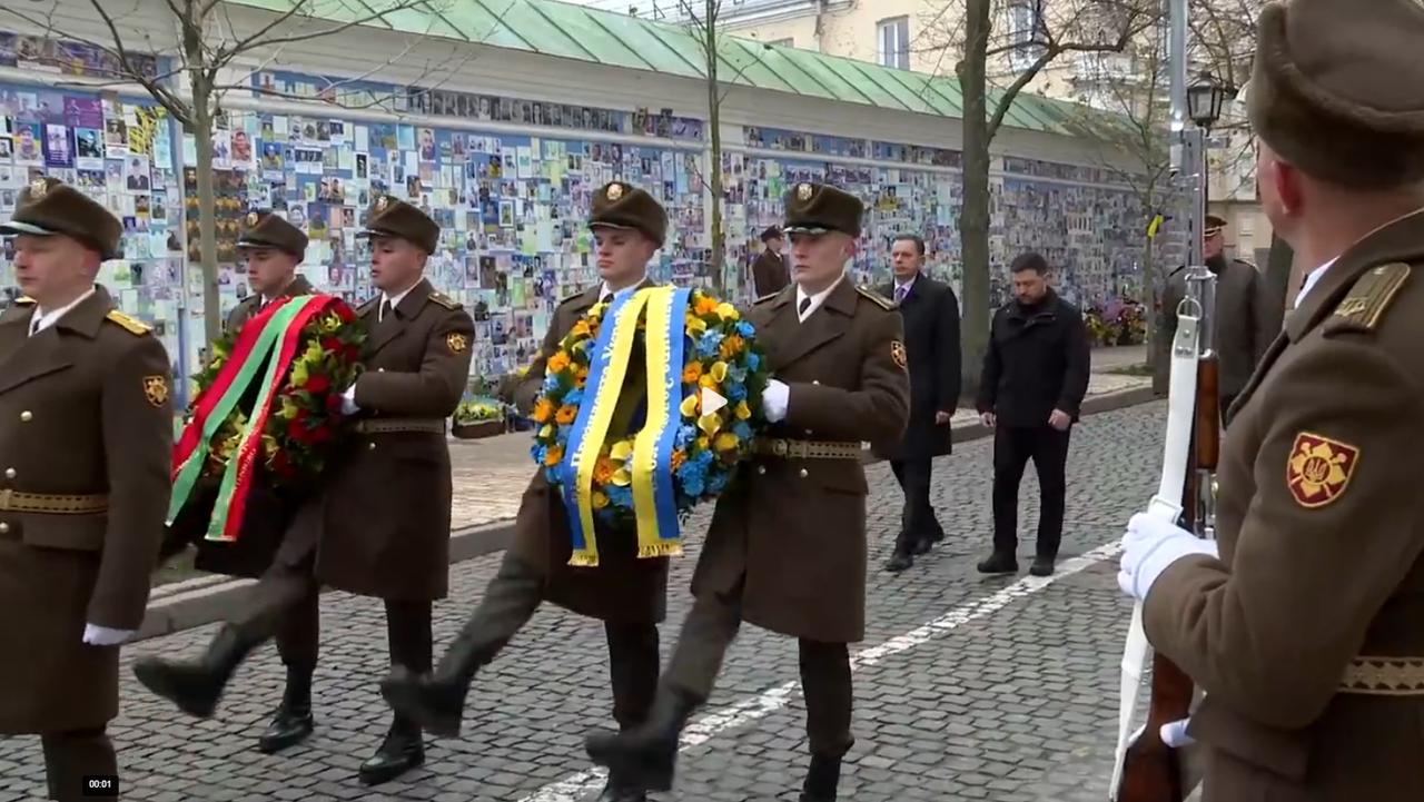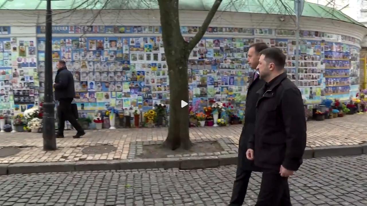 这堵墙 已然成为乌克兰人心目中的一道哭墙 必将铭刻在乌克兰的历史记忆里 直到永远 (图:泽连斯基与首次到访基辅的葡萄牙总理蒙滕内格罗前往献花)