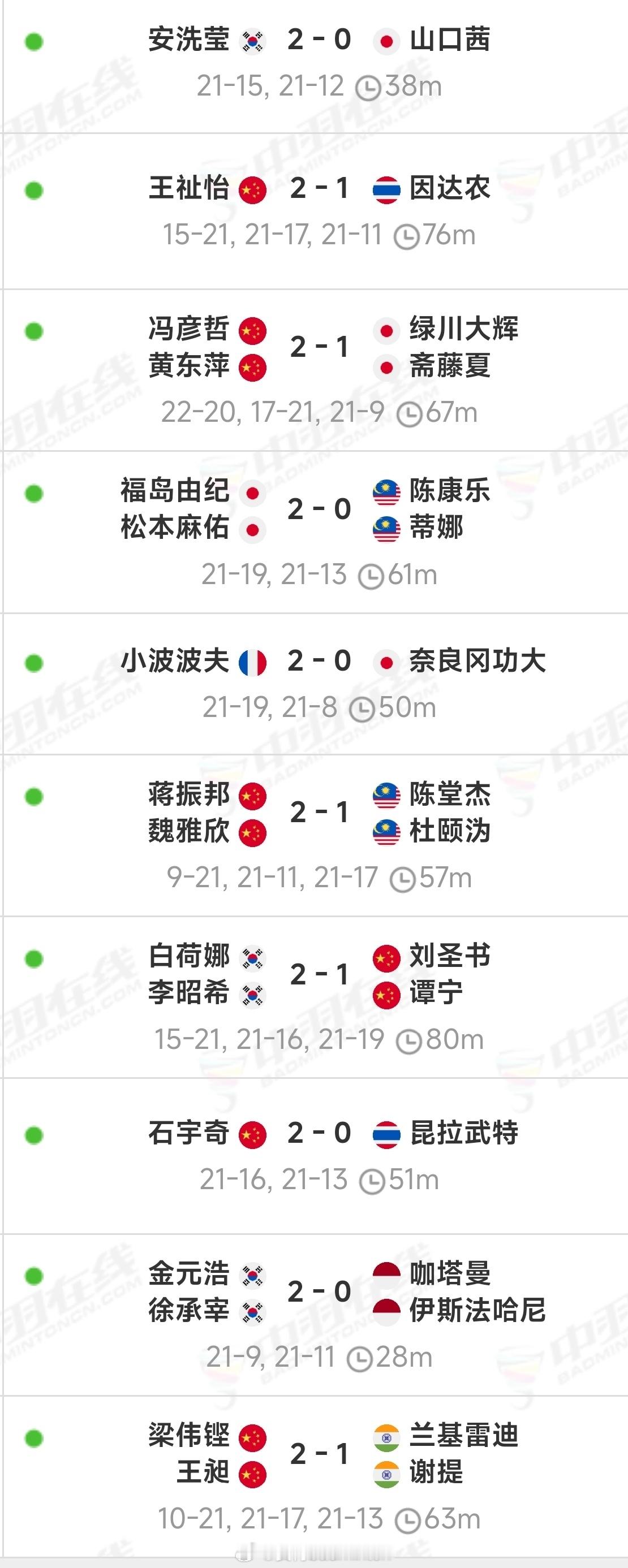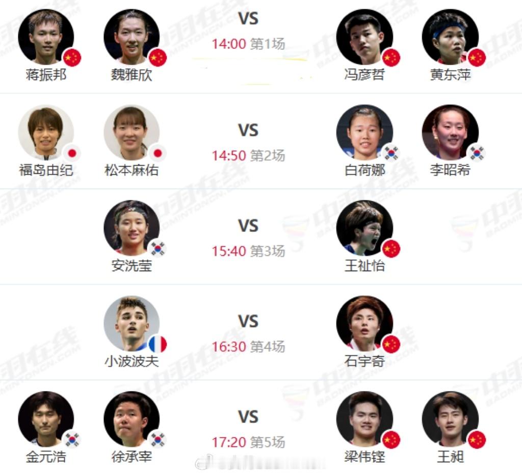 2025年世界羽联年终总决赛【决赛】赛程(图1)|【半决赛】赛果(图2)🟣一号场地(14:00🕑开赛)❶ 蒋振邦/魏雅欣🇨🇳 vs 冯彦哲/黄东萍🇨🇳(3-13)❷ 福岛由纪/松本麻佑🇯🇵 vs 白荷娜/李绍希🇰🇷(1-2)❸ 王祉怡🇨🇳 vs 安洗莹🇰🇷(4-15)❹ 石宇奇🇨🇳 vs 小波波夫🇫🇷(4-1)❺ 梁伟铿/王昶🇨🇳 vs 金元浩/徐承宰🇰🇷(0-3)直播渠道📺:羽协公众号/央视频/优酷羽球🏸观赛聊天群:羽你一起来看球综合体育🏟️聊天群:综合体育畅聊群欢迎你的加入,一起开心^O^看球,聊球!🧧赛事抽奖福利:❶ 网页链接 ❷ 网页链接 免费送🔥 ❸ 网页链接 ❹ 网页链接 梁王晋级决赛国羽总决赛四项进决赛