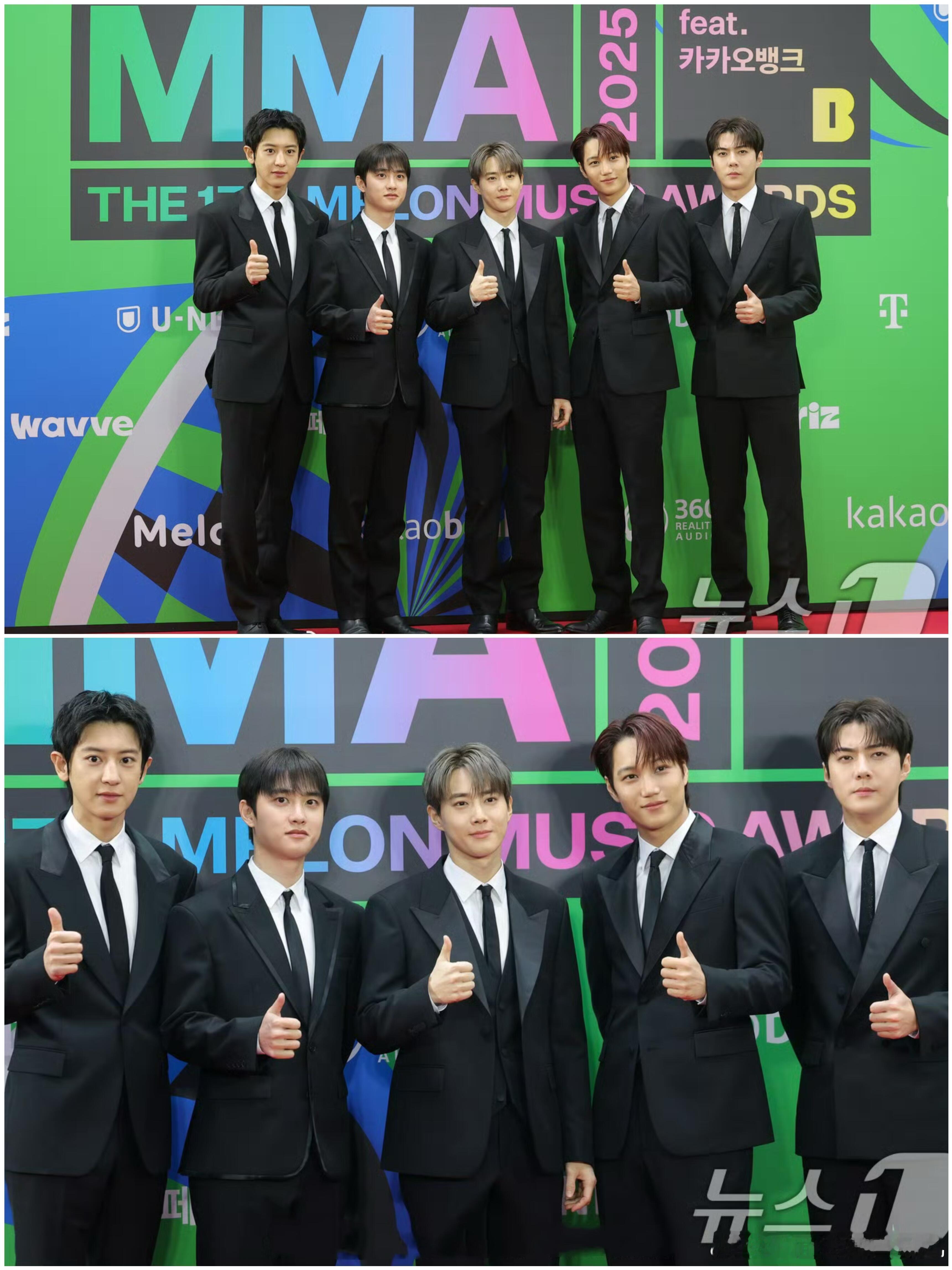 压轴出场的EXO红毯状态️🈶MMA颁奖礼红毯环节中,EXO以五人金俊勉、朴灿烈、吴世勋、都敬秀、金钟仁压轴亮相,全员黑色正装出席,互动自然,生图状态依旧能打! MMA红毯