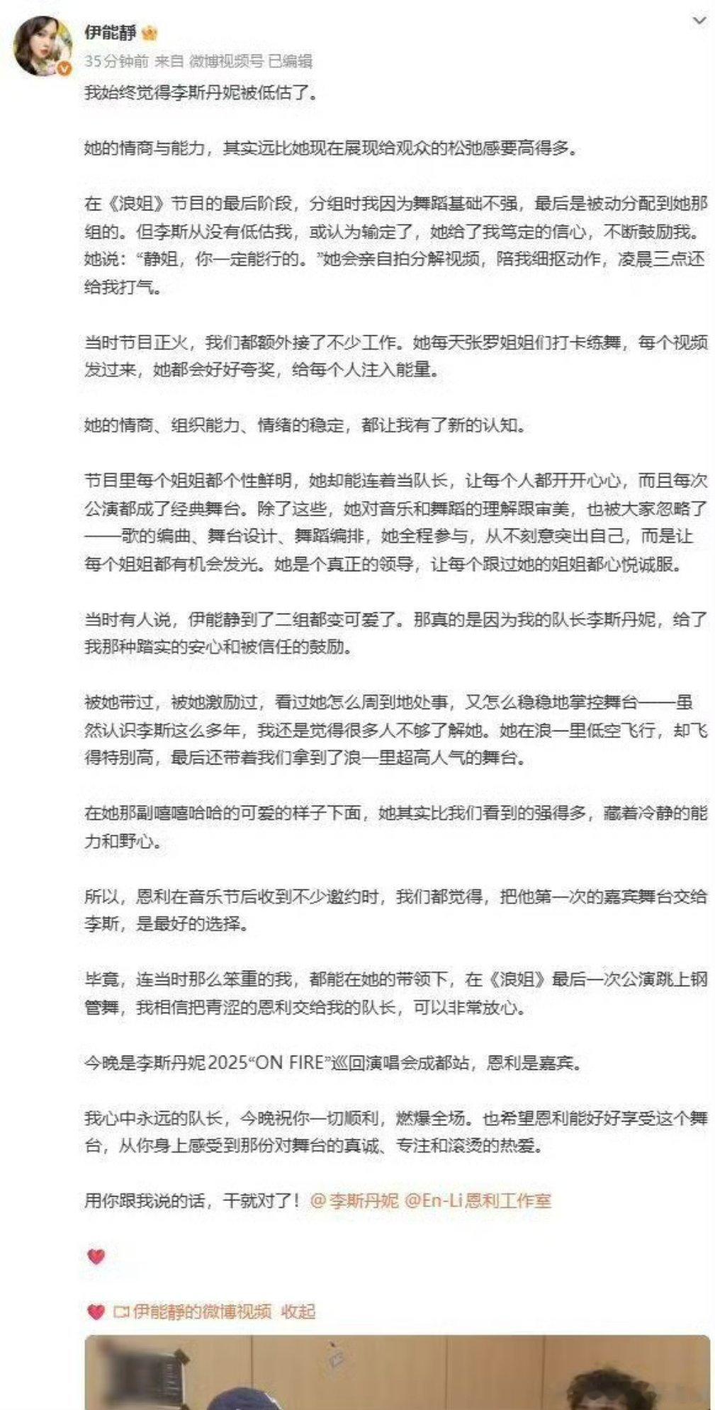 伊能静 把恩利交给李斯丹妮非常放心 谁能拒绝这样的神仙缘分!恩利作为嘉宾参加李斯丹妮的演唱会,伊能静发长文力挺,直言把恩利交给李斯丹妮非常放心。这份信任,源于李斯丹妮的优秀,她不仅在舞台上表现出色,在生活中也十分靠谱。