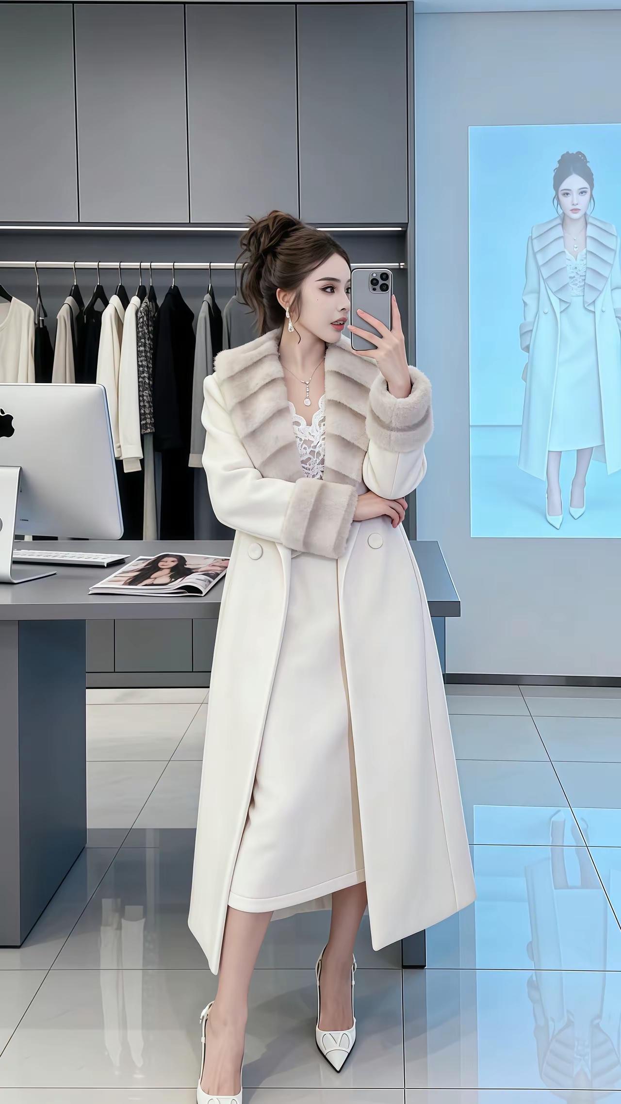 冬日漫步,白色风衣与落叶的浪漫邂逅。