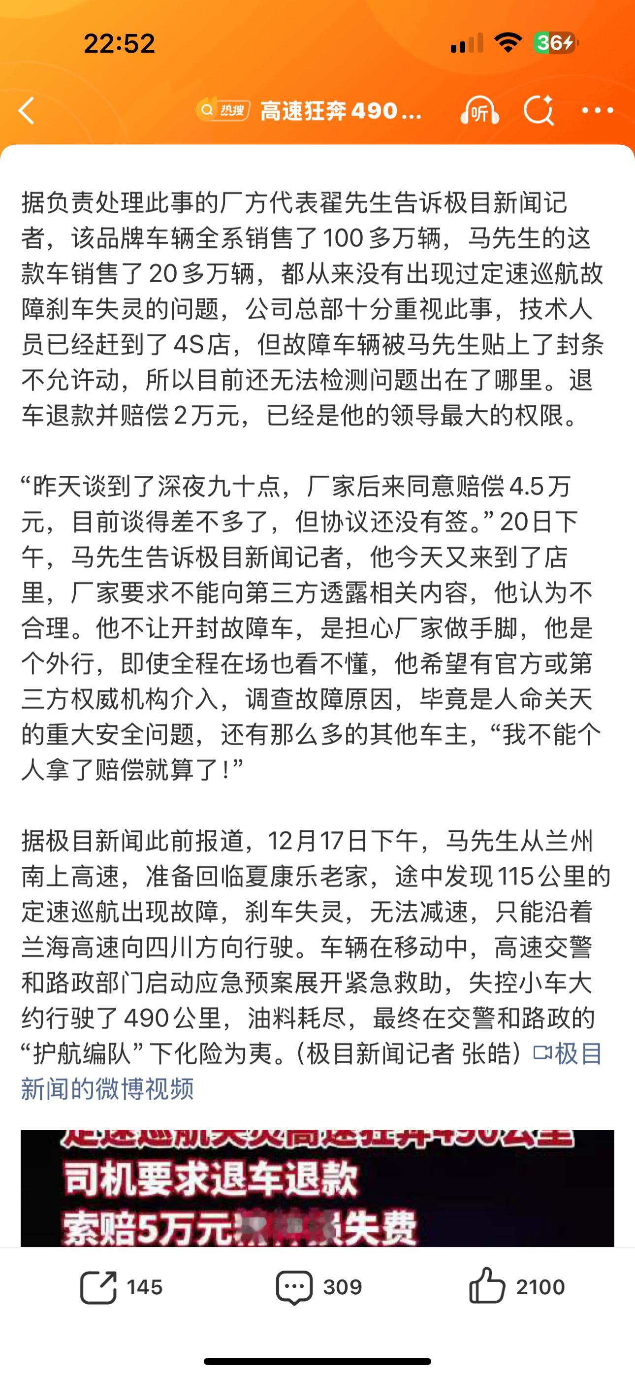 高速狂奔490公里司机要求退车退款 划重点:1、厂家同意退款退车并赔偿2万元,车主认为太少,后来又涨到4.5万元!但协议还没签!2、负责处理此事的厂方代表翟先生表示,该品牌车辆全系销售了100多万辆,马先生的这款车销售了20多万辆,都从来没有出现过定速巡航故障刹车失灵的问题!3、公司总部十分重视此事,技术人员已经赶到了4S店,但故障车辆被马先生贴上了封条不允许动,所以目前还无法检测问题出在了哪里。