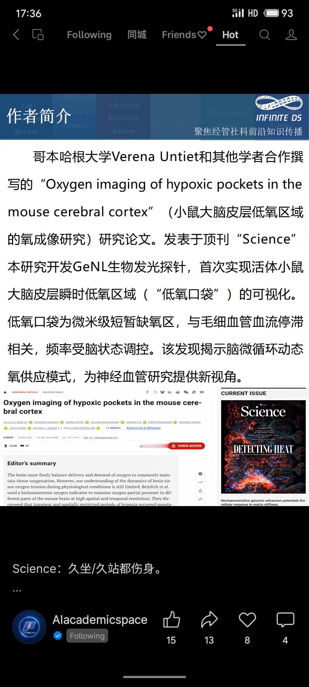 研究开发GeNL生物发光探针,首次实现活体小鼠大脑皮层瞬时“低氧口袋”可视化。该现象与毛细血管血流停滞相关,频率受大脑状态调控,揭示了微循环动态氧供应的新机制,为神经血管研究提供新视角。