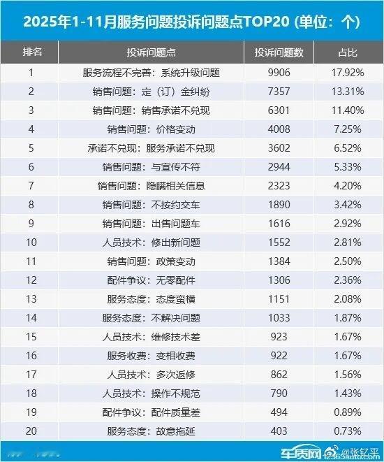 车质网统计的2025年1-11月份车主投诉问题TOP20。其中系统升级问题、交易纠纷、销售承诺这三项占比最高。个人看法:其中系统问题影响的是日常体验,如果车企长期不重视,那么几乎肯定会影响再购率,口碑也会崩。定金纠纷和销售承诺则是很多人买车时心力交瘁的现象,门店的销售规范还是需要车企来约束,不然很难有大的改善。新能源汽车大v聊车