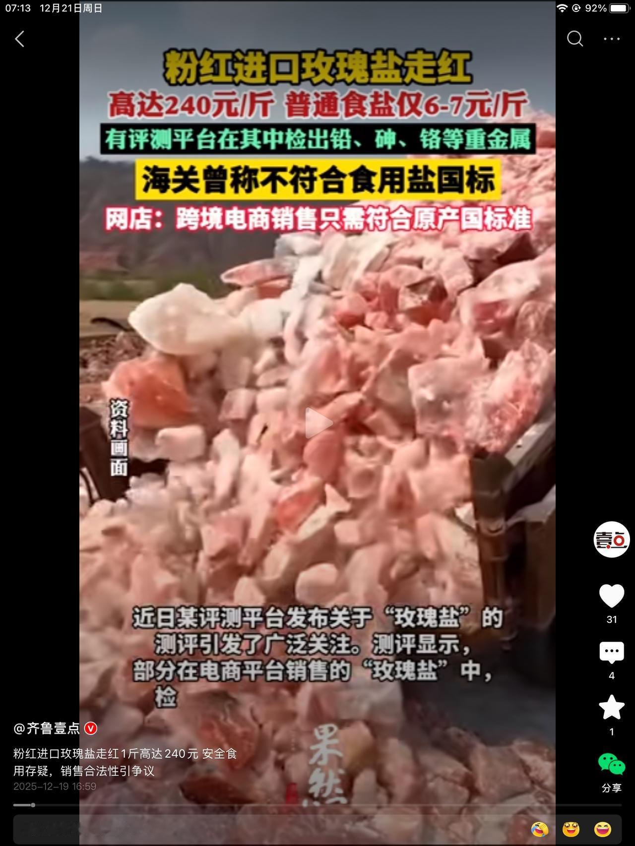 一大早刷到网上卖的这个玫瑰盐,重金属和有害物质超标。我乐了。真的,这次是不自觉的乐。我没买,这玩意儿有啥吃的。香吗?日料吃过一回,忘记了。 崇洋媚外的东西就是好吗?超标,只要不超原产国的标准就行了,这不是闹吗?家里有好几袋子的快拿出来扔了吧!不能吃了,也不能为了这几袋子,自己去检测吧!得不偿失,丢了得了。以后进口的东西,还是要谨慎。