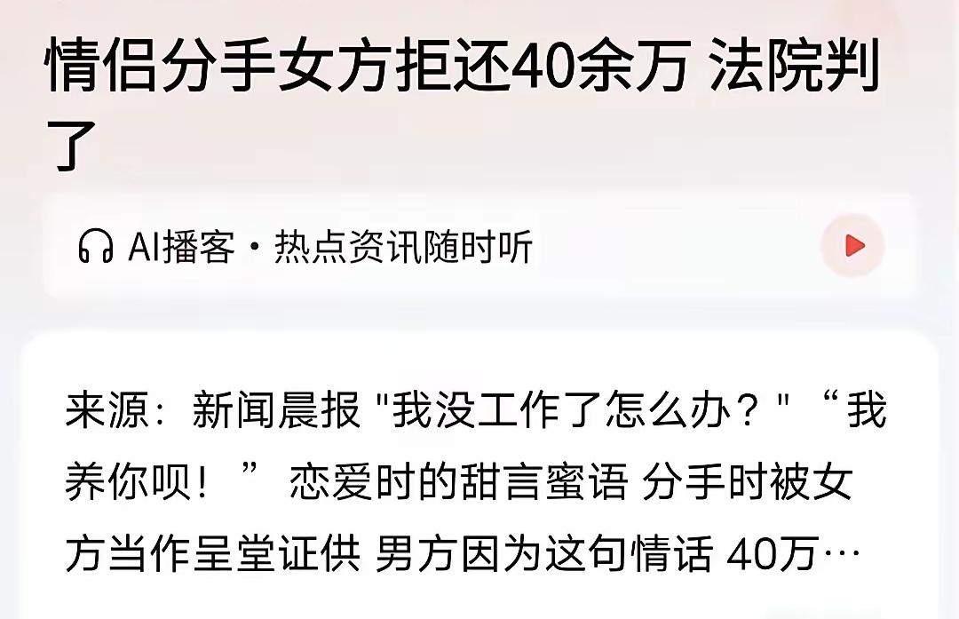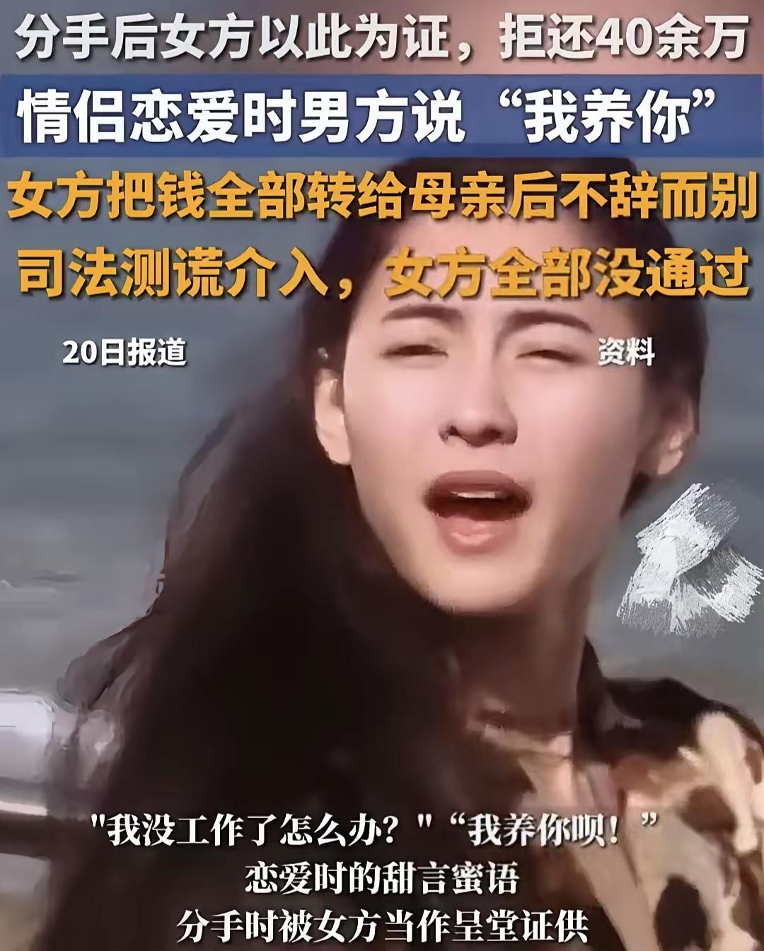 “以后我养你”,这句话能值40万吗?上海一对情侣攒钱买房,女友却将57万全部转给母亲后消失…法庭上,她竟拿出这句情话当证据! 为和女友在上海有个家,小吴拼命工作省吃俭用,每月往两人共同的“买房账户”里存钱,不到一年就存了40多万。女友小陈失业时,他贴心安慰:“没关系,以后我养你。”没想到,这句情侣间寻常的承诺,日后竟成了法庭上争夺40万巨款的焦点。 两人恋爱同居,感情一度甜蜜,还专门开了账户攒首付。小吴觉得未来可期,干劲十足。转折发生在谈婚论嫁时。2024年10月,小吴带小陈回自己老家,父母欢喜,给了上万元订婚红包。可轮到见女方家长时,场面却异常尴尬:小吴买了数万元礼物,女方父亲却连面都没露。 回上海后,事情急转直下。小陈母亲前来同住,不久,小吴就发现他们辛辛苦苦攒下的57万元购房款,被女友一次性转到了其母亲账户。紧接着,更让他心寒的事发生了:小陈删除了两人的大量聊天记录,随后和母亲一起从租住的房子里悄悄搬走,不辞而别。 人财两空的小吴无奈将前女友告上法庭,要求返还购房款、金镯子等共计38万元。法庭上,小陈的辩解令人惊讶:她先是声称小吴转的钱是自愿给的生活费,因为他承诺过“我养你”;后又改口说钱早已以现金形式还清,只是没有证据。 由于双方说法完全相反,法院委托进行了心理测试(测谎)。结果显示,小吴的陈述真实可信,而小陈的辩解可信度低。关键证据在于,小吴每月规律性的大额转账,结合微信中大量关于看房、讨论买房的聊天记录,清晰证明了这笔钱的唯一目的——共同购房。 法律如何看待“我养你”这句承诺? 法院最终没有采纳女方的说法。法官认为,情侣间“我养你”这类情感表达,不同于具有法律效力的书面赠与合同。小吴持续、大额且有明确目的的转账,性质是以结婚为条件的“共同购房出资”。如今结婚未成,这笔钱理应返还。 最终,法院判决小陈返还小吴30万元,并承担相关费用。这个判决明确传递了一个信号:法律保护基于真实意思表示的财产关系,而非恋爱中随意的情话。 故事让人唏嘘。感情好的时候,千好万好;一旦生变,曾经的付出与承诺都可能被重新解读。 这件事也给我们提了个醒:恋爱中涉及重大钱财往来,哪怕关系再亲密,也需要多一分清醒和记录。毕竟,人心易变,而白纸黑字的证据和清晰的钱款性质,才是对自己最好的保护。 大家觉得呢?谈恋爱时,对方说“我养你”,你会当真吗?涉及大额金钱,应该怎么处理才能既不影响感情,又保护自己?